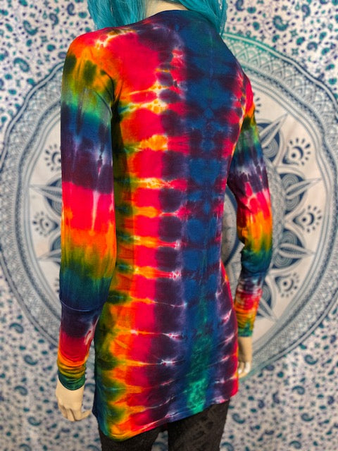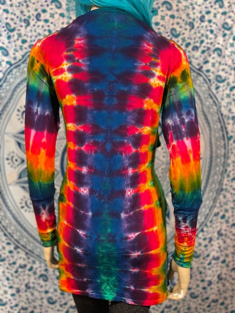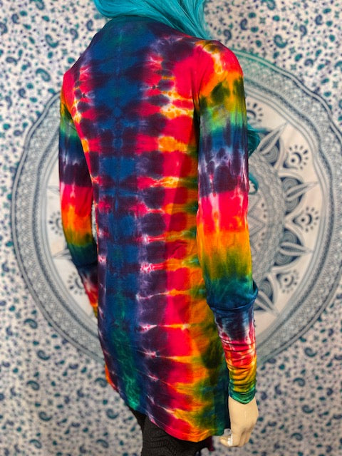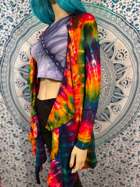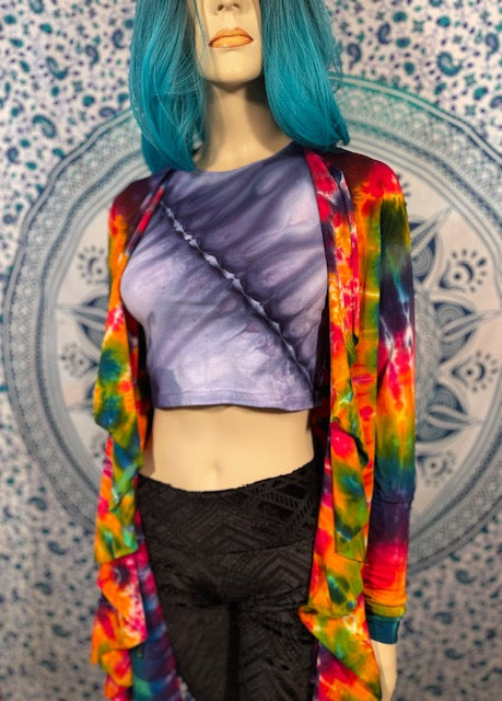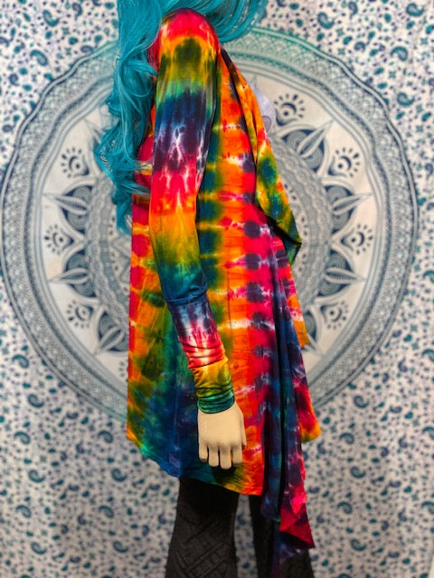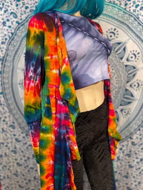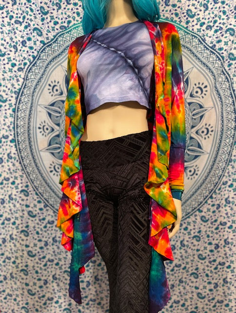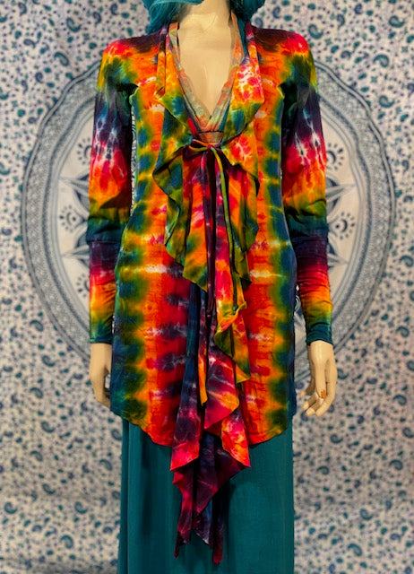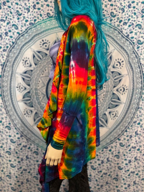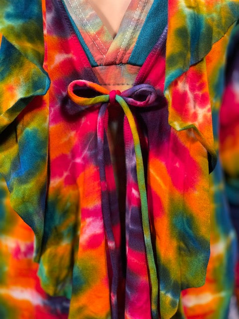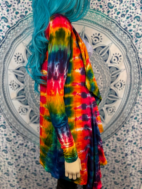 Fitted arms that make you feel pulled together, with a cascading collar, a tie at the chest so you can close her on up and POCKETS, this is the ultimate in tie dye!