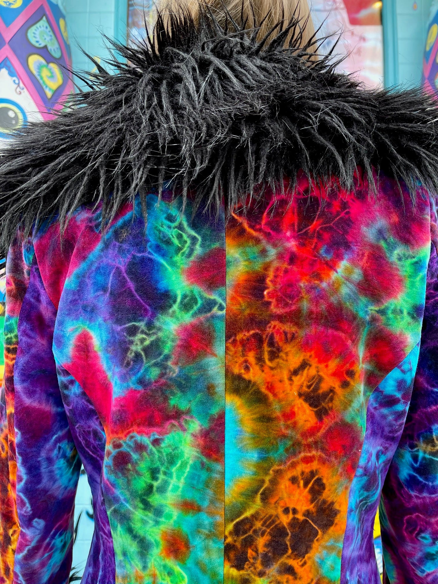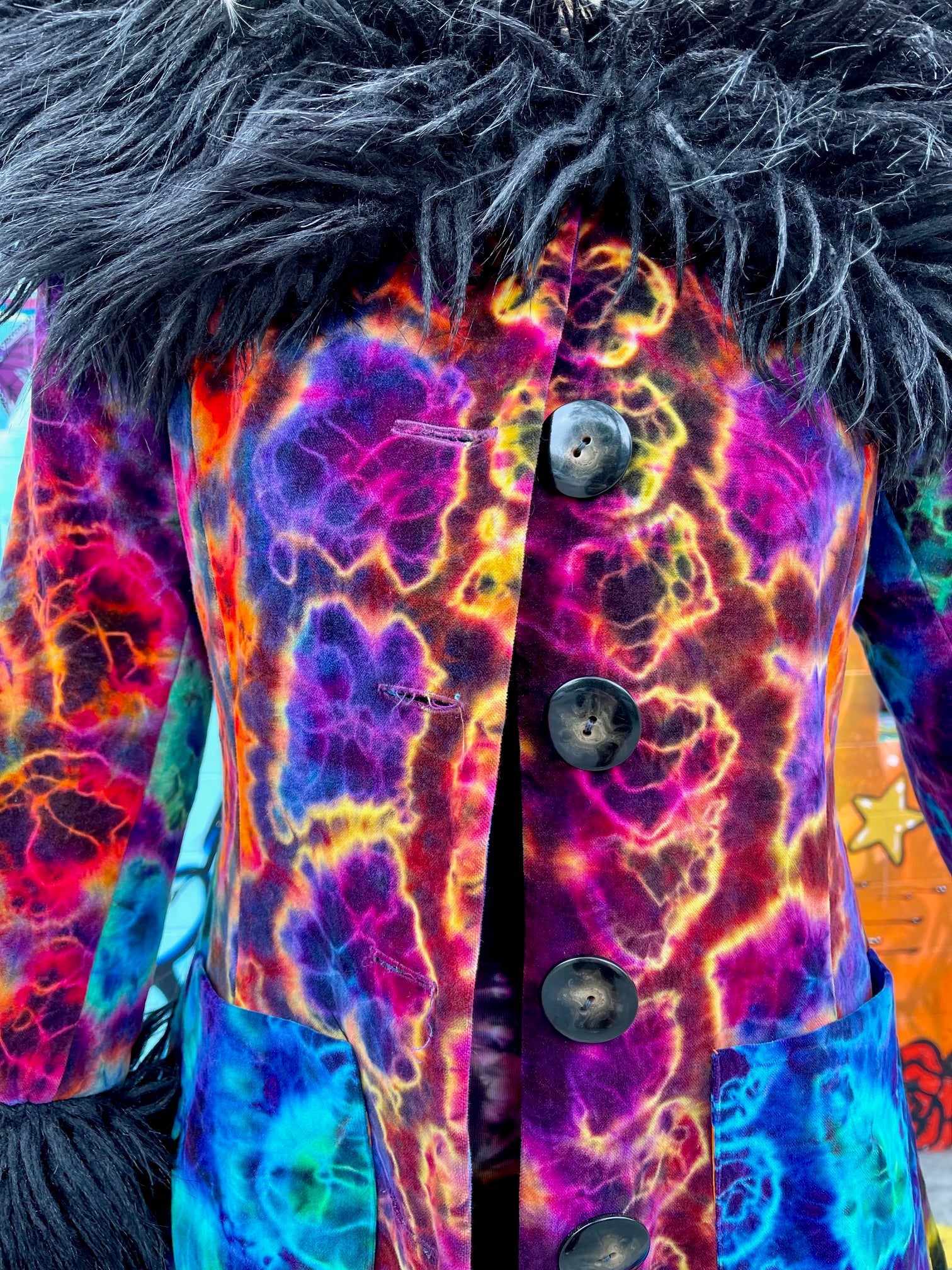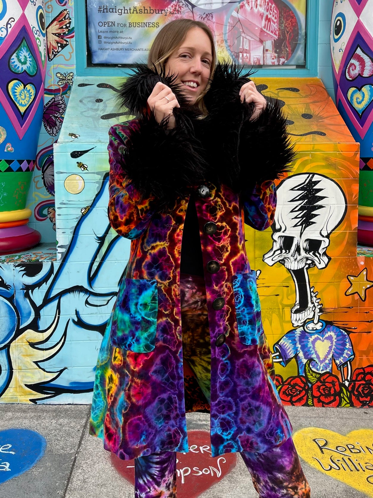 How we met Philine. Sunshine was at SF Fashion week a few years back and she had been hankering for some new coats, she has like 4 pirate coats but wanted something for more everyday wear. As she wondered around the room before the fashion show she found these amazing coats that she wanted even though they were not tiedyed (if you know Sunshine, you know that she wears everything tiedye so this emotion was new to her.) . Sunshine approached Philine and said, "I have this idea about these coats but tiedyed!" Philine smiled at Sunshine like she was nuts. Sunshine then said, "I am totally crazy, but these coats are going to be AWESOME."