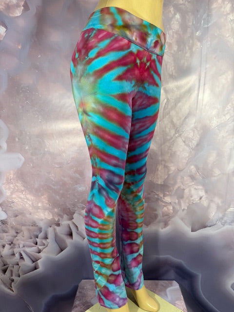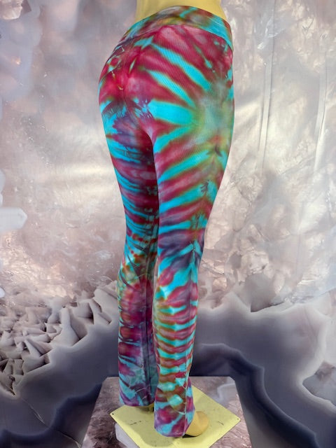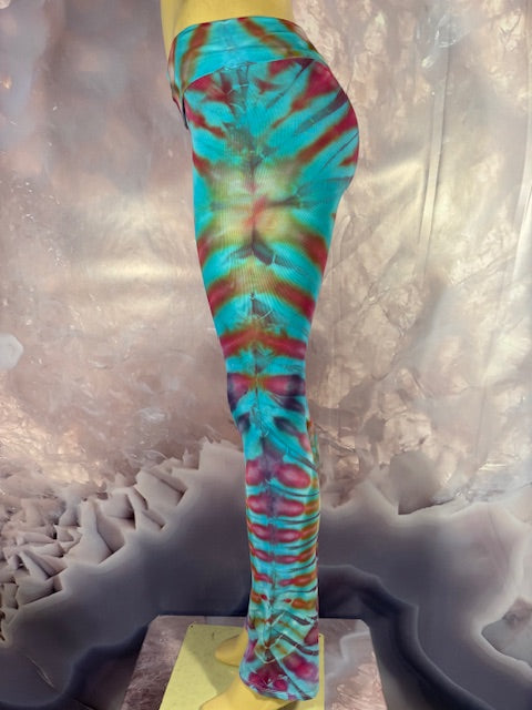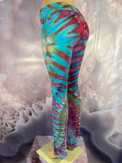 Royal Apparel branded USA made yoga pants with fold over waist.  Tiedyed by Brittany of Tyrannosaurus Dyes of Colorado.  We LOVE Brittany's tiedye!!!  We all go bananas every time we get a box from her in...JUST WOW!