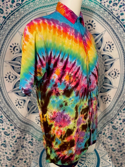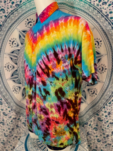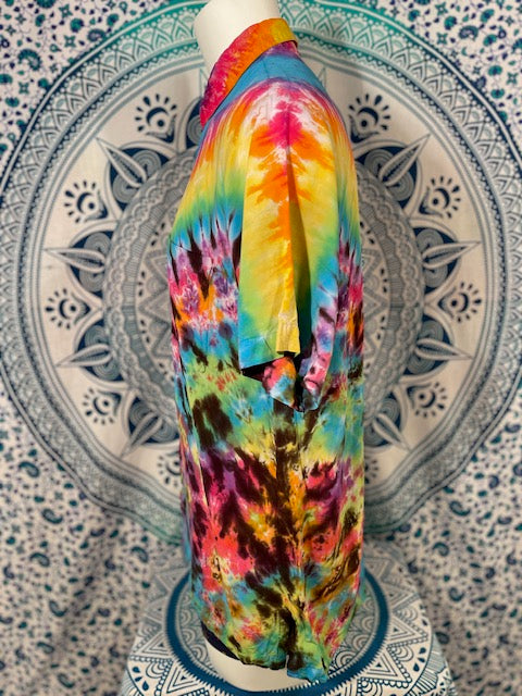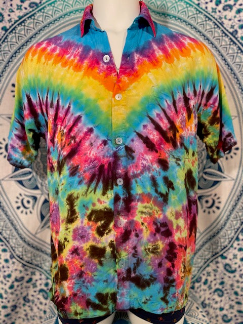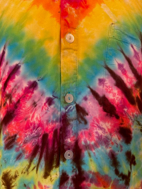Stay airy and free flowing in this tiedye button down by Tyrannosaurus Dyes aka Brittany from Lafayette, Colorado...it can also button up!