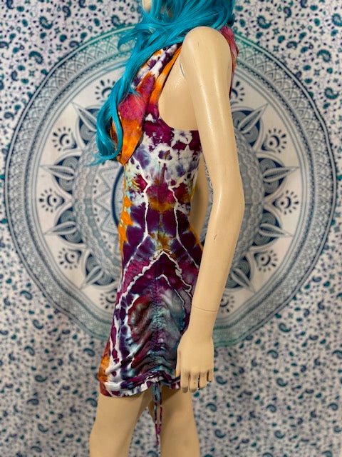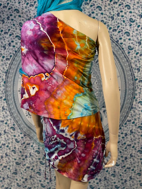 This dress may be worn as a Dress with a Cowl Neck, you can move that neck to a hood, or pull it over your shoulders to keep warm...WAIT...there is more, slip your arm out and have this epic one shoulder look or pop the other arm out and it is a tube top...AND you can pull up the strings in the skirt and bring it up, up, UP as short as you wanna go...even till that dress becomes a shirt.