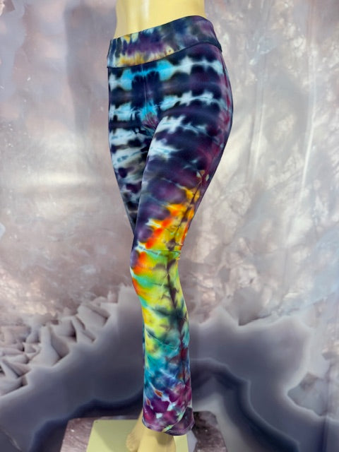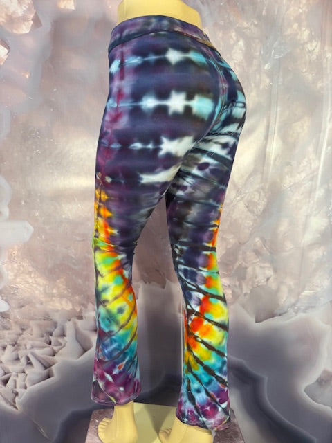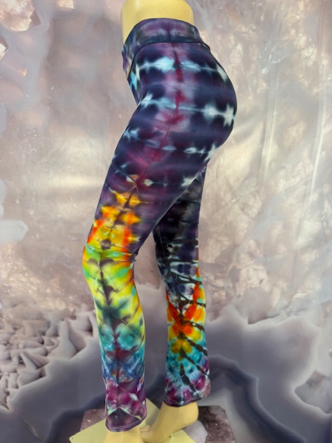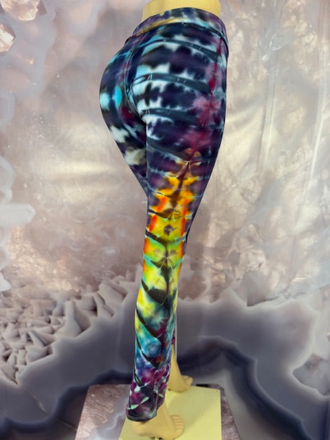 Royal Apparel branded USA made yoga pants with fold over waist.  Tiedyed by Brittany of Tyrannosaurus Dyes of Colorado.  We LOVE Brittany's tiedye!!!  We all go bananas every time we get a box from her in...JUST WOW!
