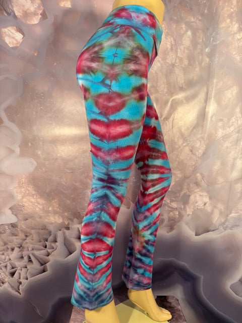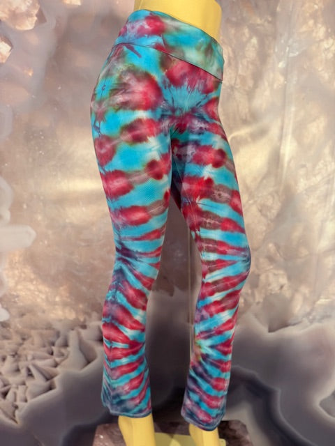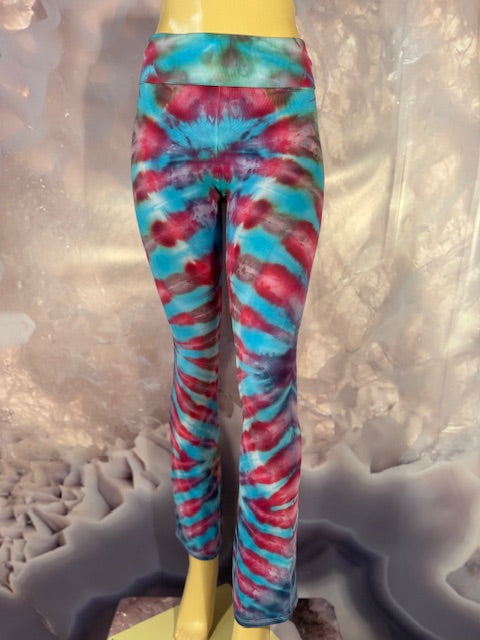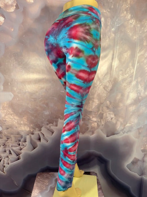 Royal Apparel branded USA made yoga pants with fold over waist.  Tiedyed by Brittany of Tyrannosaurus Dyes of Colorado.  We LOVE Brittany's tiedye!!!  We all go bananas every time we get a box from her in...JUST WOW!