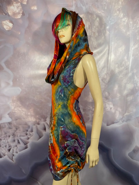 This dress may be worn as a Dress with a Cowl Neck, you can move that neck to a hood, or pull it over your shoulders to keep warm...WAIT...there is more, slip your arm out and have this epic one shoulder look or pop the other arm out and it is a tube top...AND you can pull up the strings in the skirt and bring it up, up, UP as short as you wanna go...even till that dress becomes a shirt.