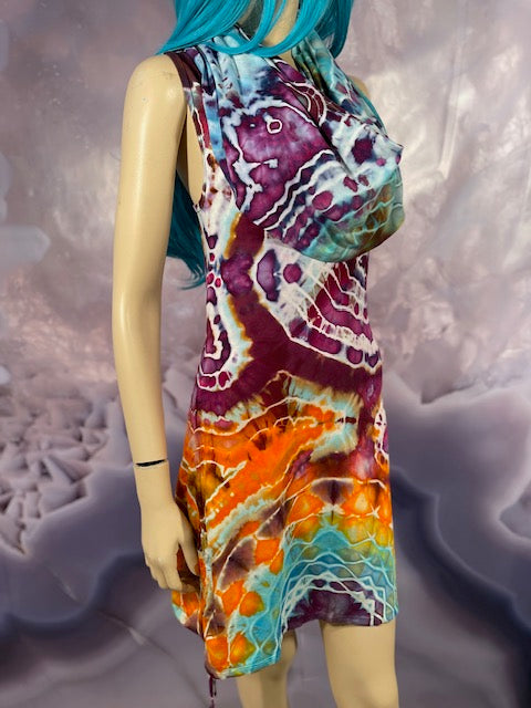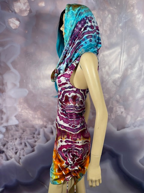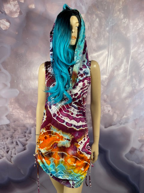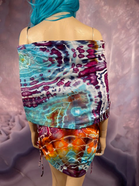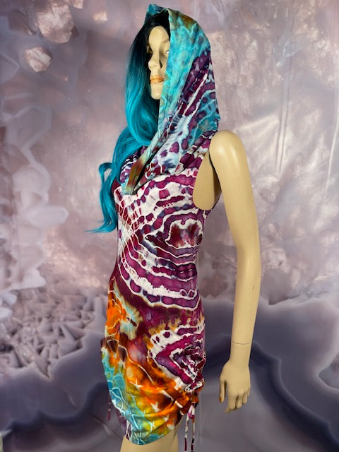 This dress may be worn as a Dress with a Cowl Neck, you can move that neck to a hood, or pull it over your shoulders to keep warm...WAIT...there is more, slip your arm out and have this epic one shoulder look or pop the other arm out and it is a tube top...AND you can pull up the strings in the skirt and bring it up, up, UP as short as you wanna go...even till that dress becomes a shirt.