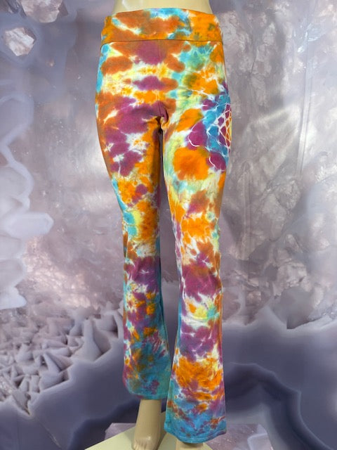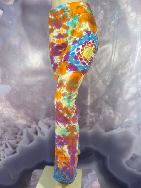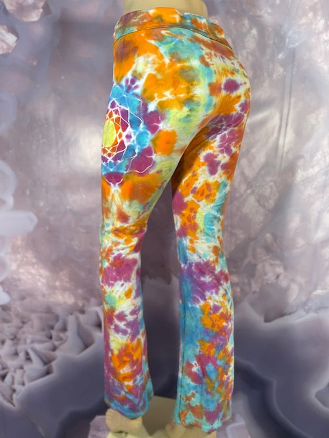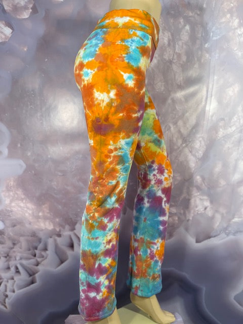 Royal Apparel branded USA made yoga pants with fold over waist. Tiedyed by Brittany of Tyrannosaurus Dyes of Colorado. We LOVE Brittany's tiedye!!! We all go bananas every time we get a box from her in...JUST WOW!