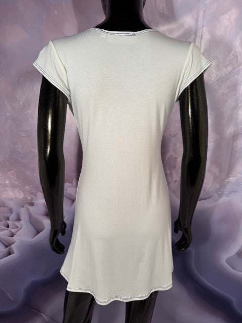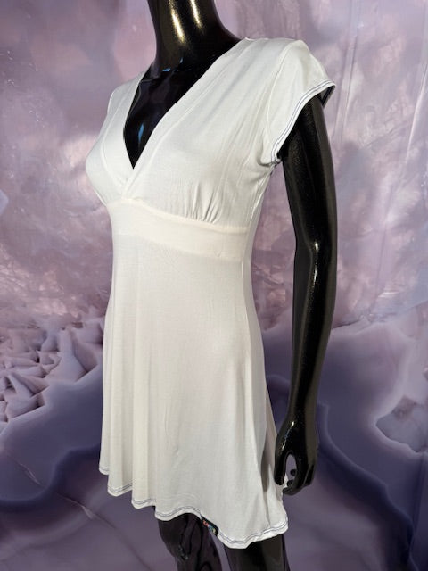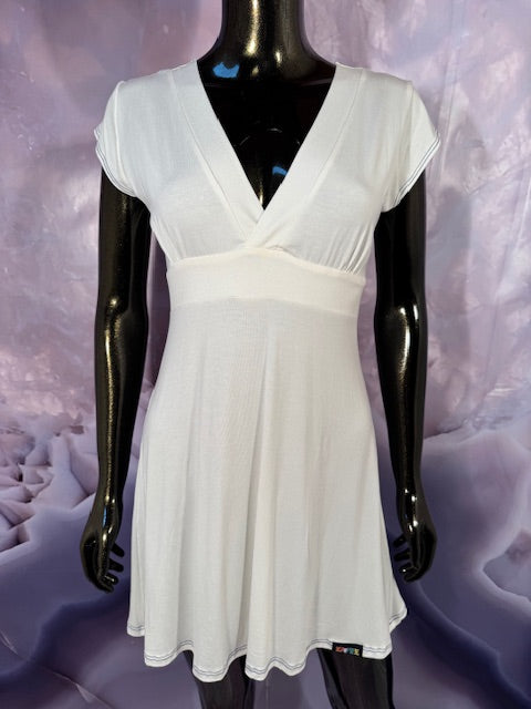 Cap sleeves with a band under the chest. Hits on the upper/mid thigh