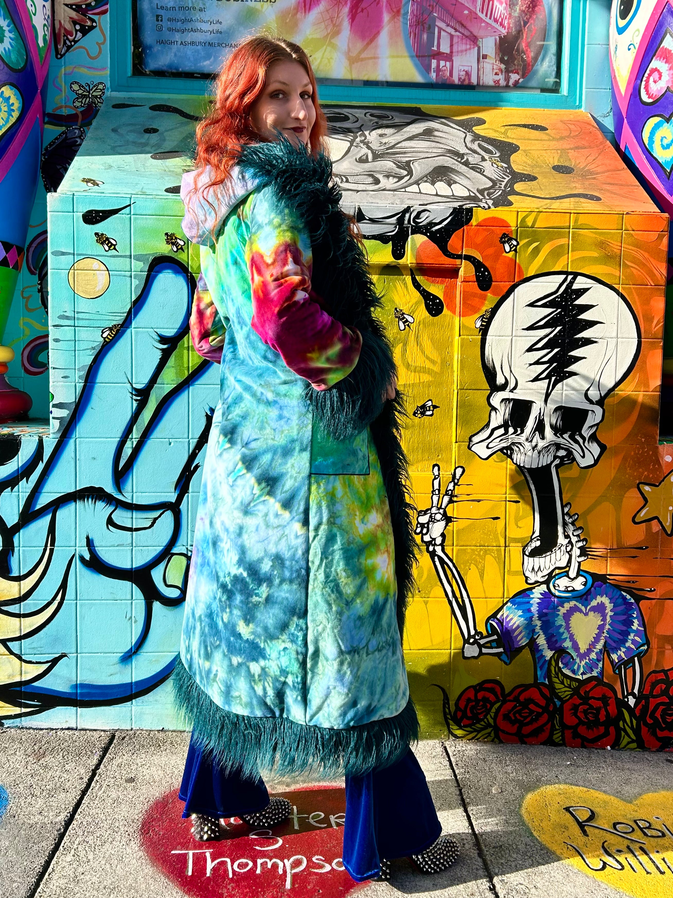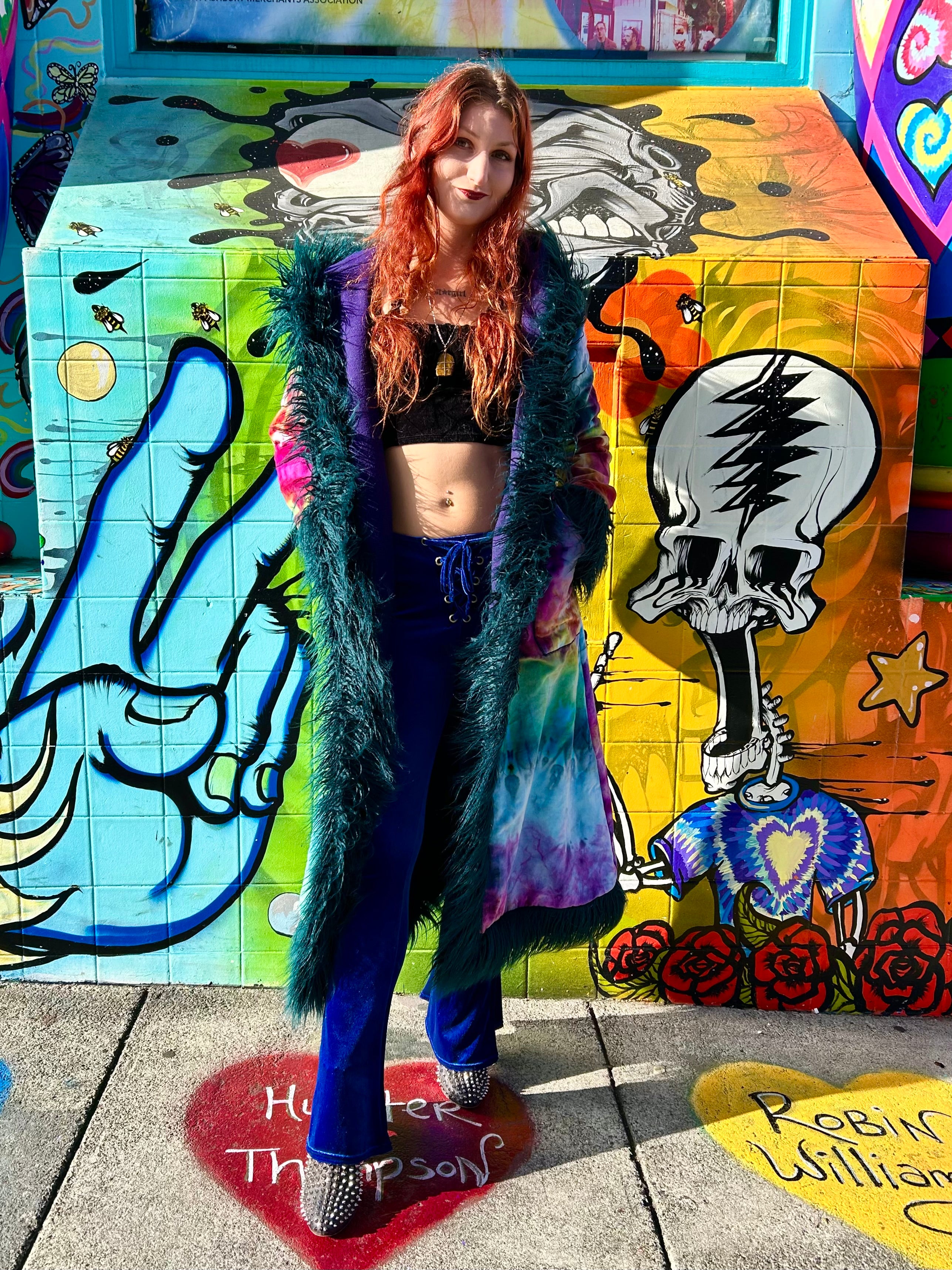 We tiedye these velvet pieces ourselves in our Haight Ashbury Studio and then send them over to Tamo for her magic!