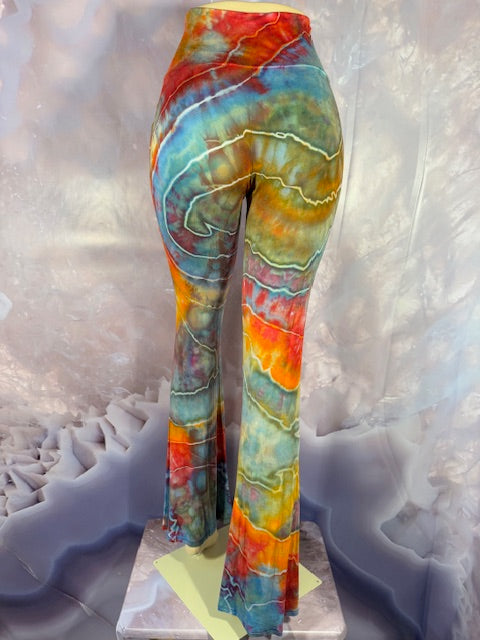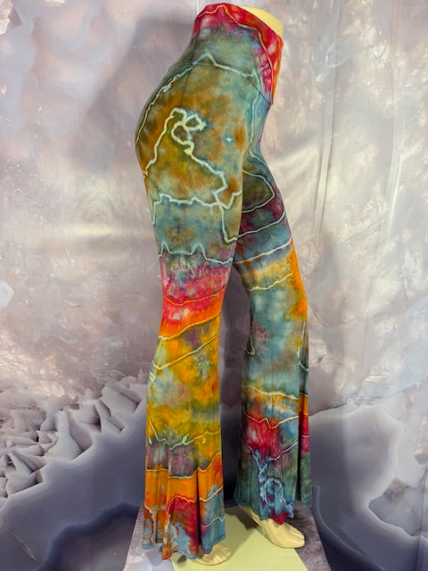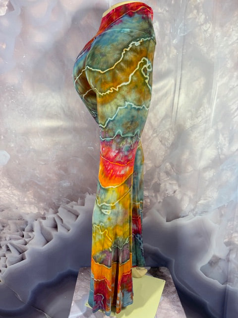 These Pants have a slight Bell starting above the knee and a waist that can be high waisted or folded over. The silhouette is long and sleek.