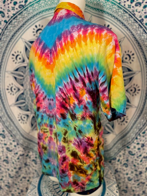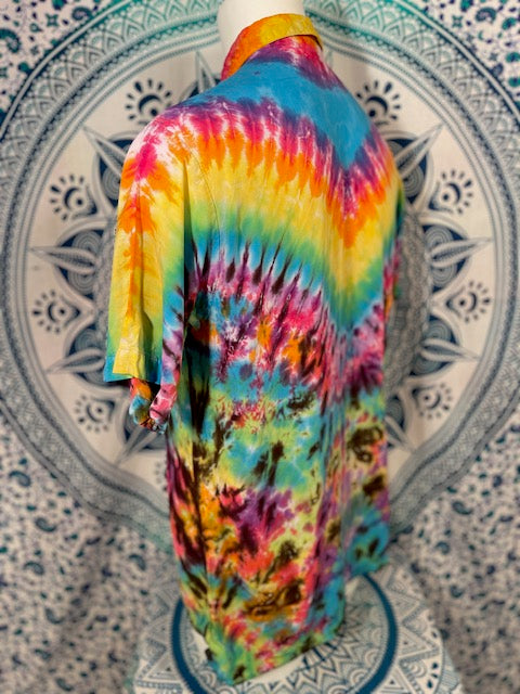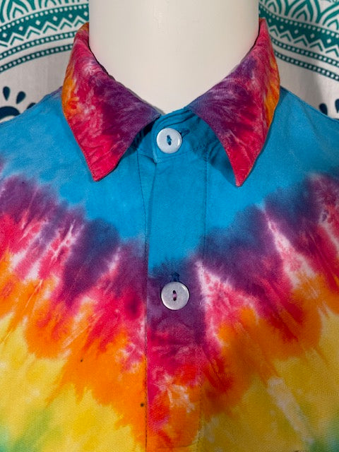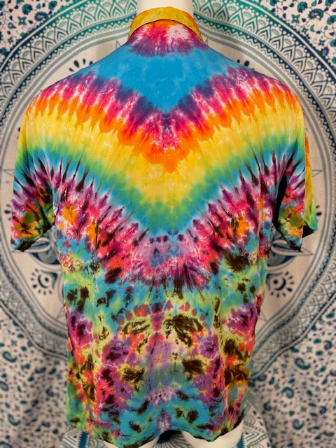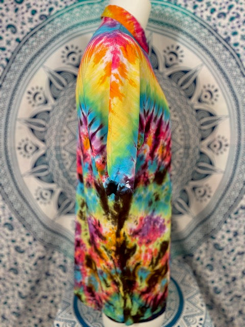 Stay airy and free flowing in this tiedye button down by Tyrannosaurus Dyes aka Brittany from Lafayette, Colorado...it can also button up!