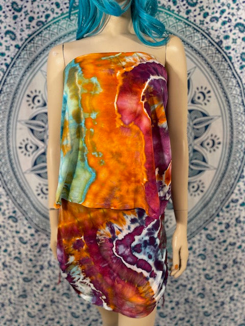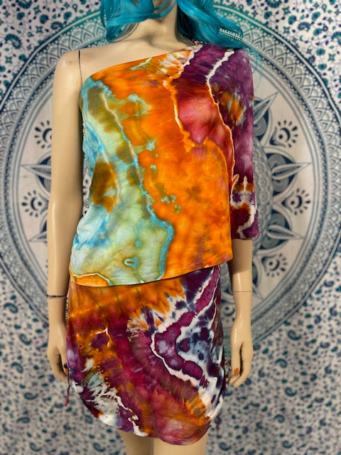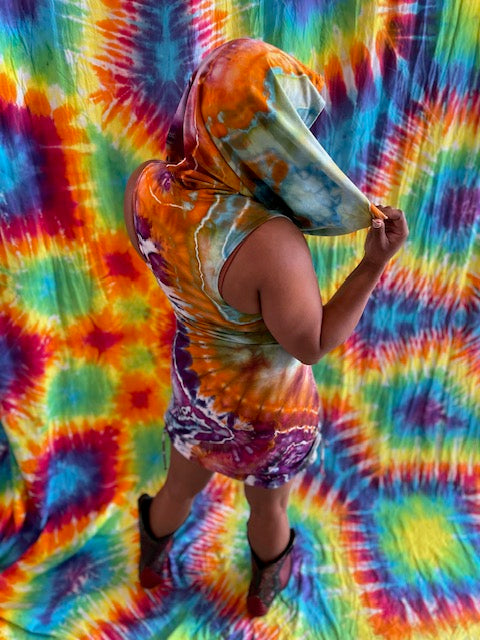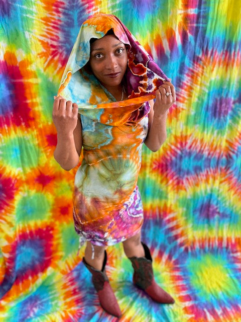 Last quarter we flew Mary Beth Osburn of Marybgoround Dyes in Colorado out to our tiedye studio! She did some collaborations with our in house dye master, Ravan Alexandra...and magic happened...including these dresses!