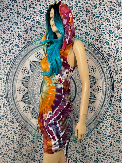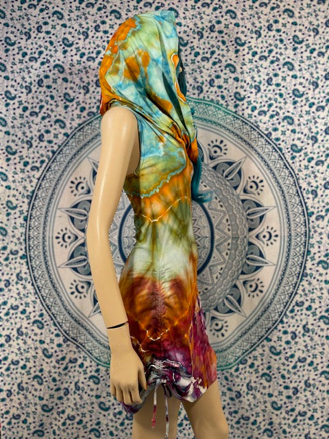 This dress may be worn as a Dress with a Cowl Neck, you can move that neck to a hood, or pull it over your shoulders to keep warm...WAIT...there is more, slip your arm out and have this epic one shoulder look or pop the other arm out and it is a tube top...AND you can pull up the strings in the skirt and bring it up, up, UP as short as you wanna go...even till that dress becomes a shirt.