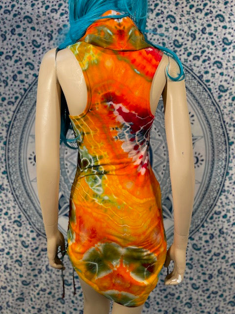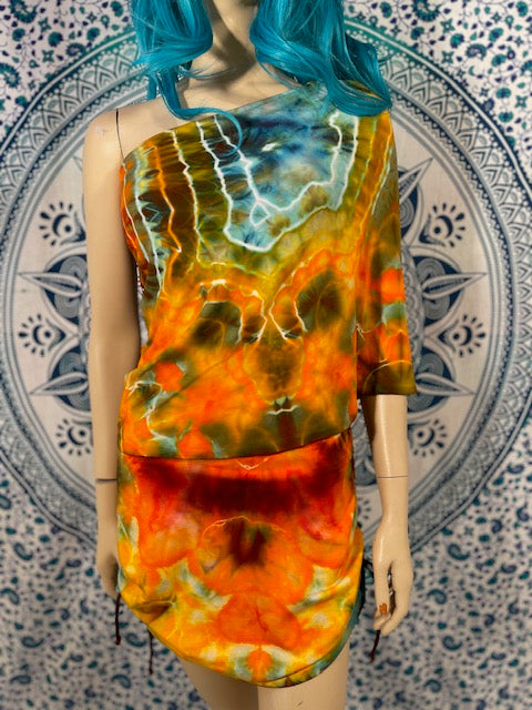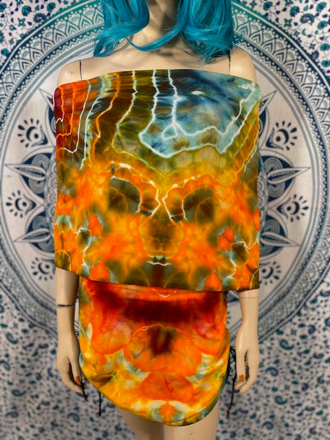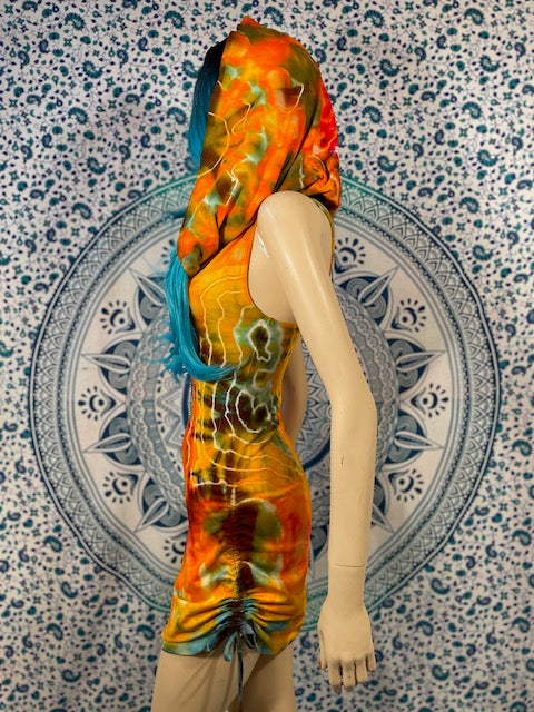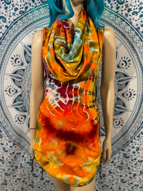 This dress may be worn as a Dress with a Cowl Neck, you can move that neck to a hood, or pull it over your shoulders to keep warm...WAIT...there is more, slip your arm out and have this epic one shoulder look or pop the other arm out and it is a tube top...AND you can pull up the strings in the skirt and bring it up, up, UP as short as you wanna go...even till that dress becomes a shirt.