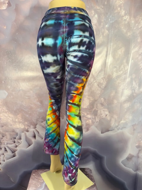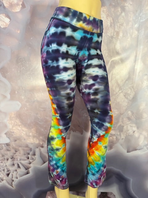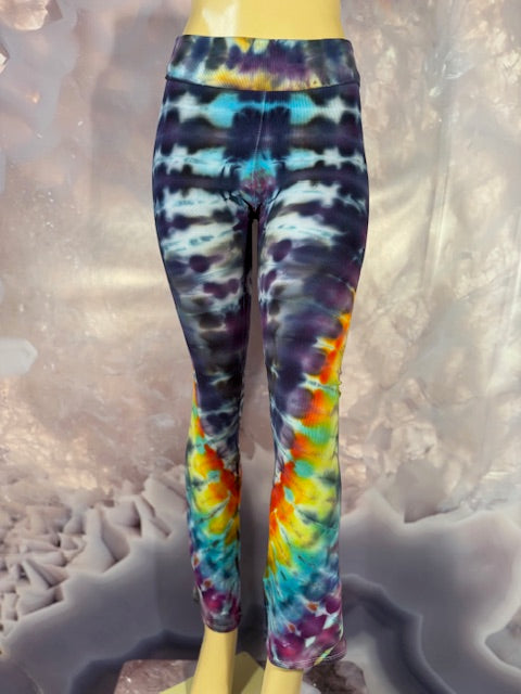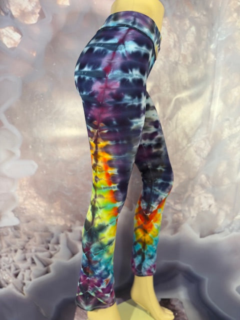 Royal Apparel branded USA made yoga pants with fold over waist.  Tiedyed by Brittany of Tyrannosaurus Dyes of Colorado.  We LOVE Brittany's tiedye!!!  We all go bananas every time we get a box from her in...JUST WOW!