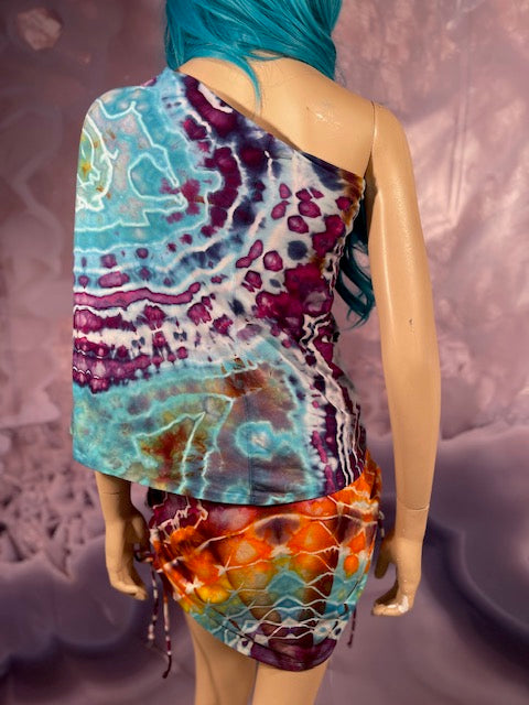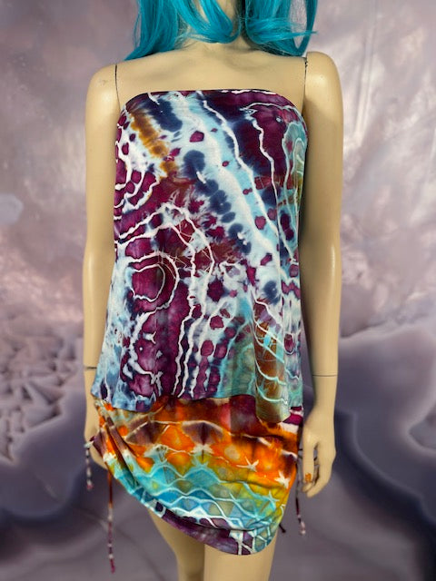 This dress may be worn as a Dress with a Cowl Neck, you can move that neck to a hood, or pull it over your shoulders to keep warm...WAIT...there is more, slip your arm out and have this epic one shoulder look or pop the other arm out and it is a tube top...AND you can pull up the strings in the skirt and bring it up, up, UP as short as you wanna go...even till that dress becomes a shirt.