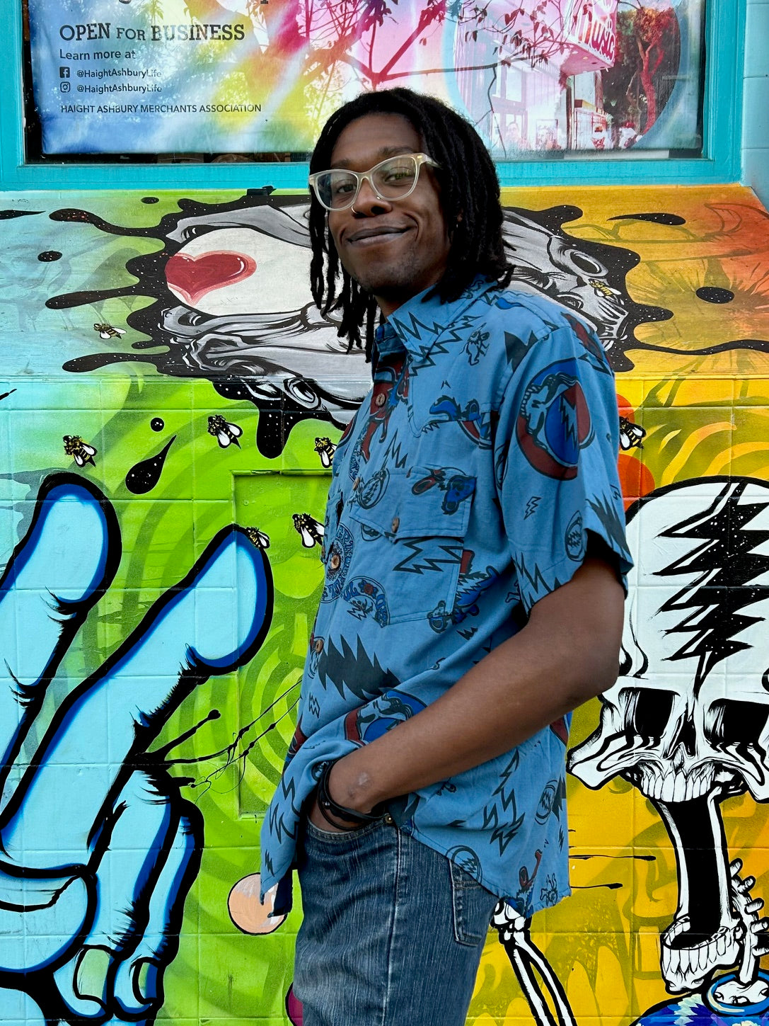 Button Up Shirt w/ GD Print BOLT PRINT. We made this shirt out of upcycle materials and over dyed for an even tone. We hand printed with our GD print, this shirt is one of a kind.