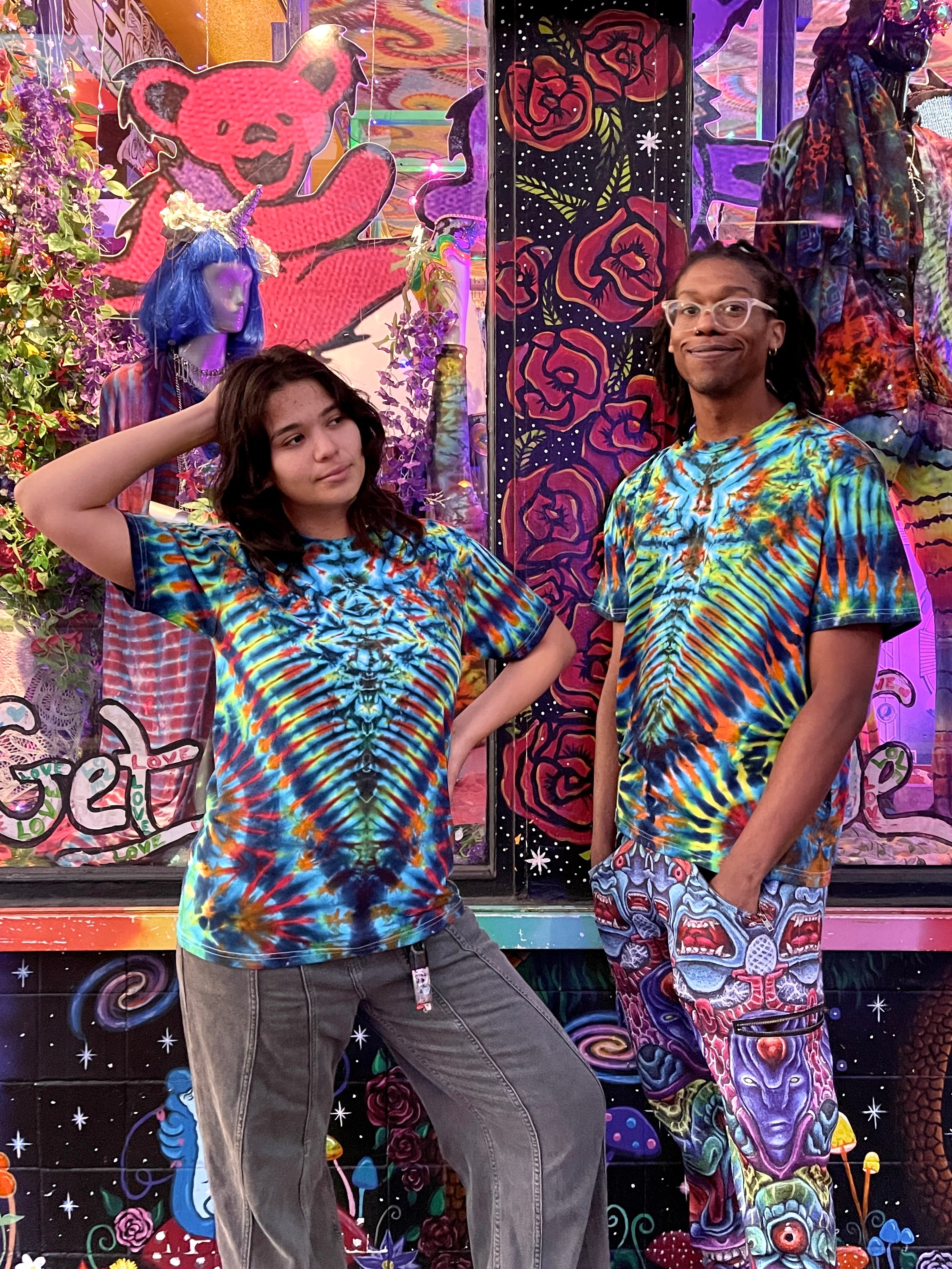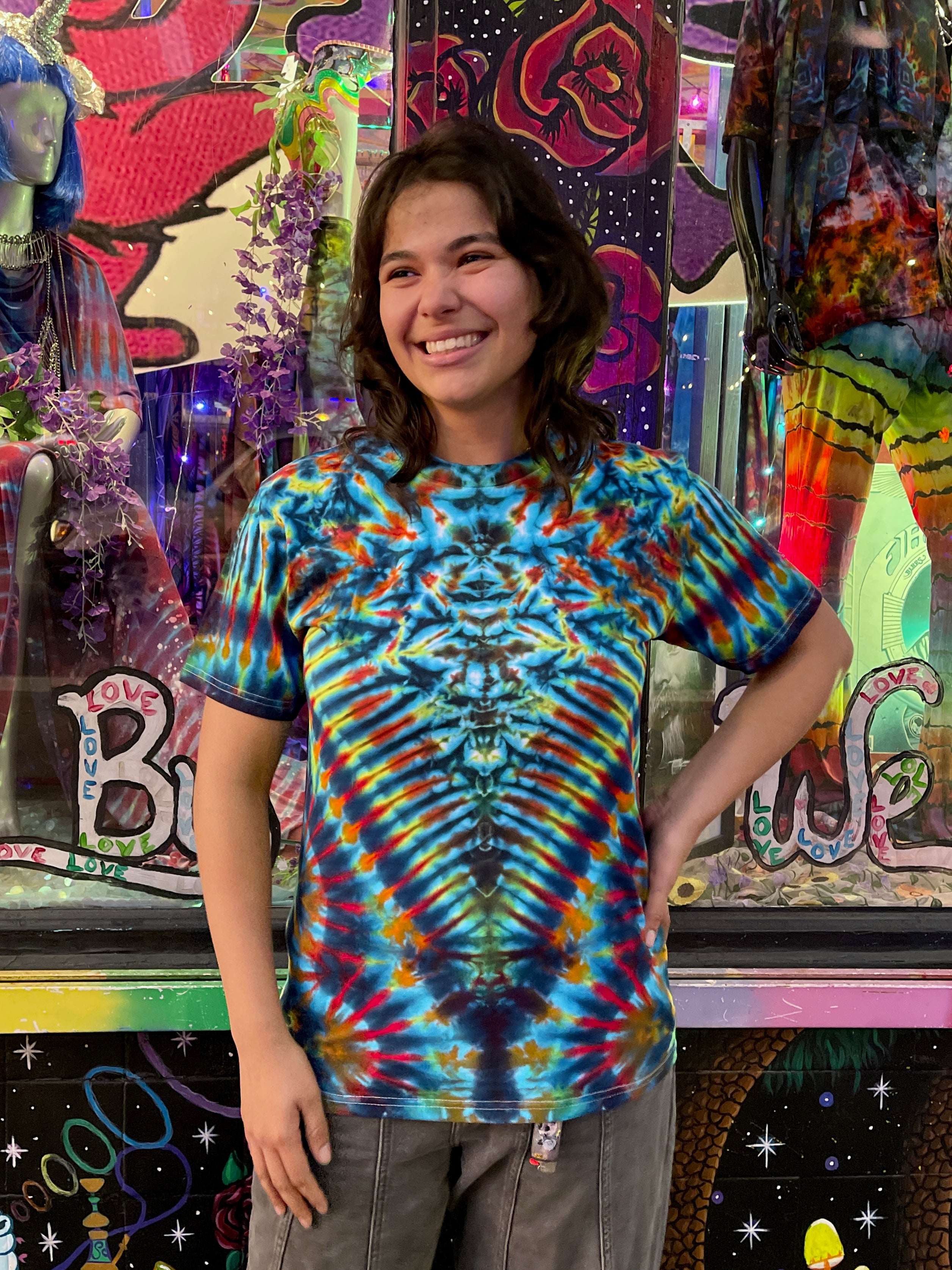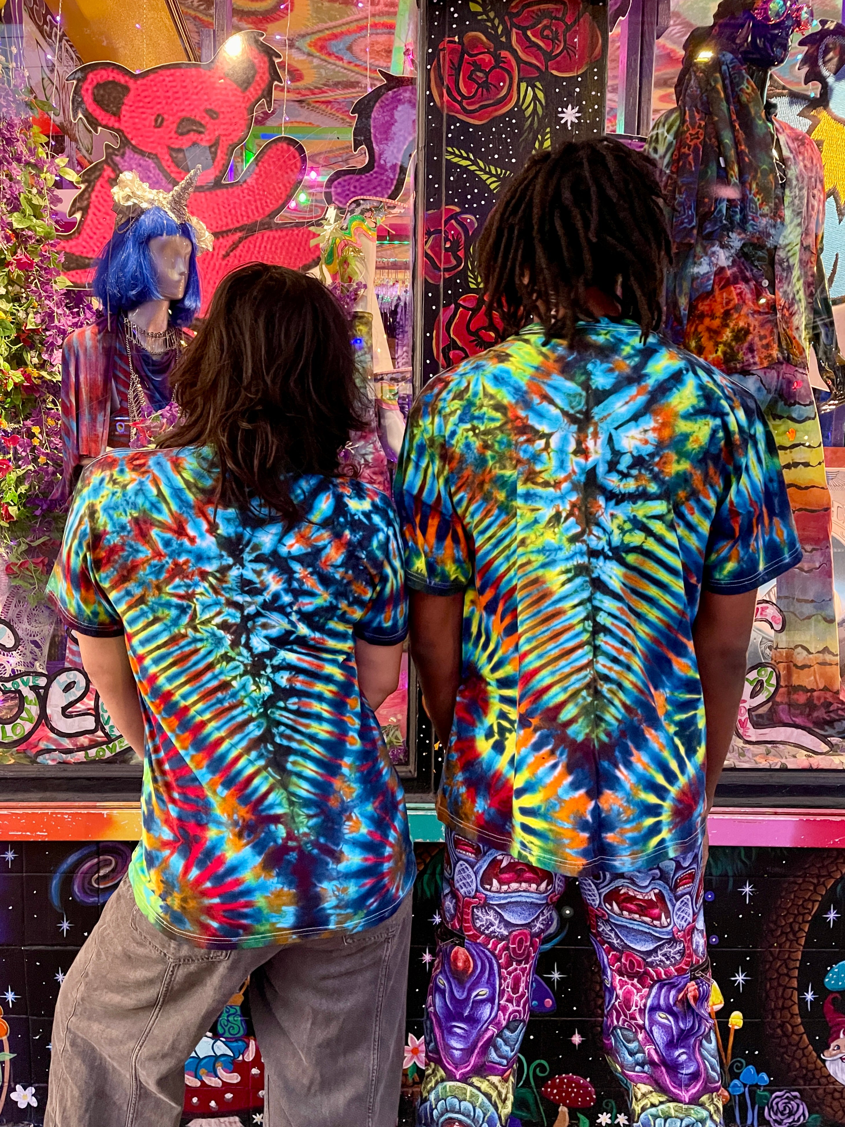 Tiedyed by the one and only Josh Wojcik from Eugene, Oregon, these shirts are ON FIRE. Josh is one of our most talented tiedye artists and just one awesome guy in general! Put some Eugene, Oregon sunshine in your wardrobe with Josh Wojcik's vibrant, handmade t-shirts. Add a bold and fun vibe to your look and support a talented artist, all in one go!