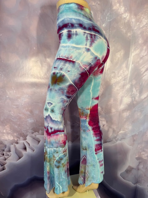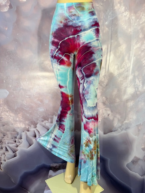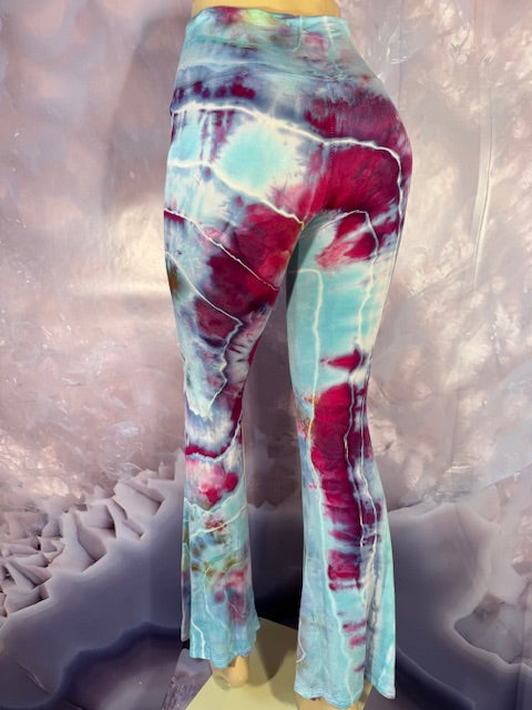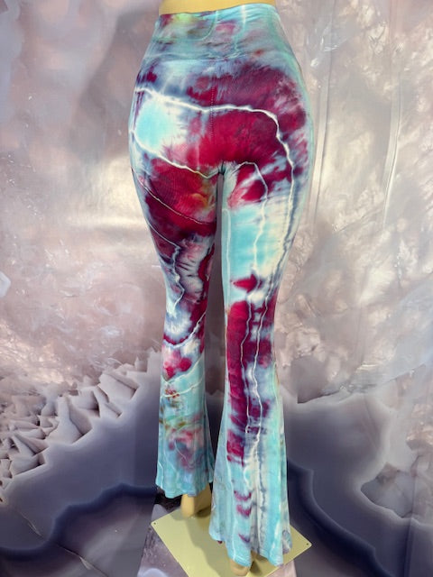 These Pants have a slight Bell starting above the knee and a waist that can be high waisted or folded over. The silhouette is long and sleek.
