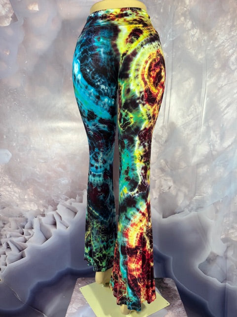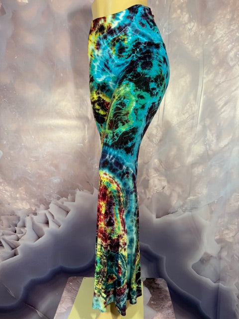 These Pants have a slight Bell starting above the knee and a waist that can be high waisted or folded over. The silhouette is long and sleek.