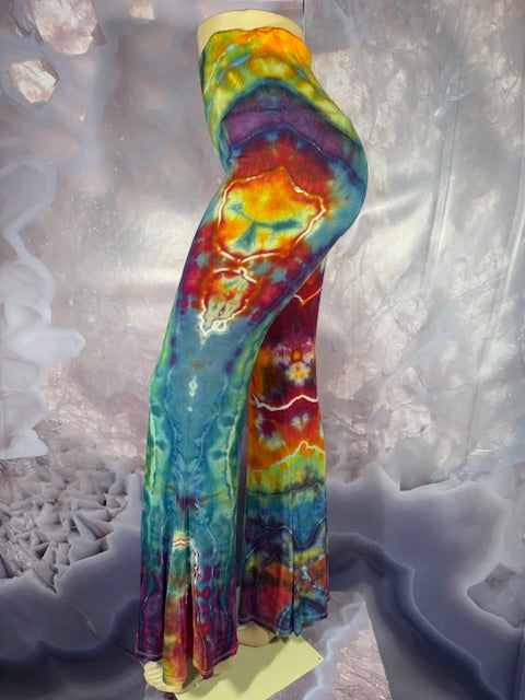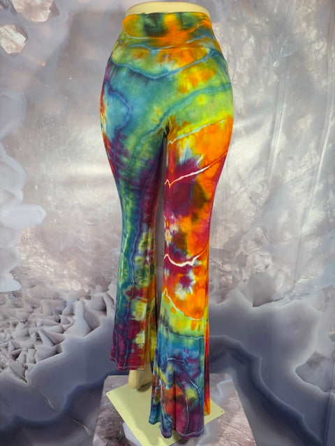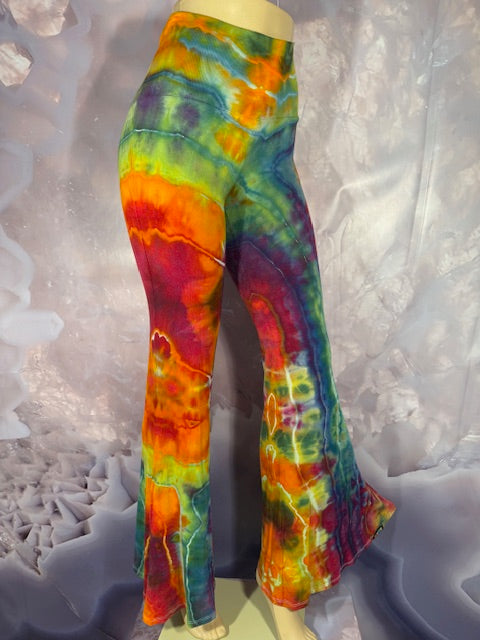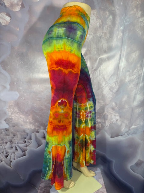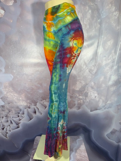 These Pants have a slight Bell starting above the knee and a waist that can be high waisted or folded over.  The silhouette is long and sleek.