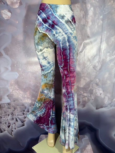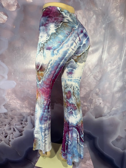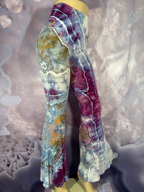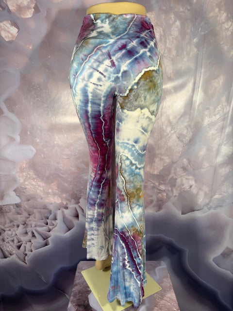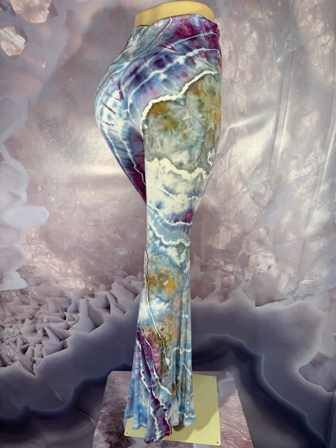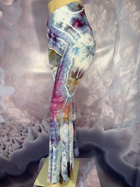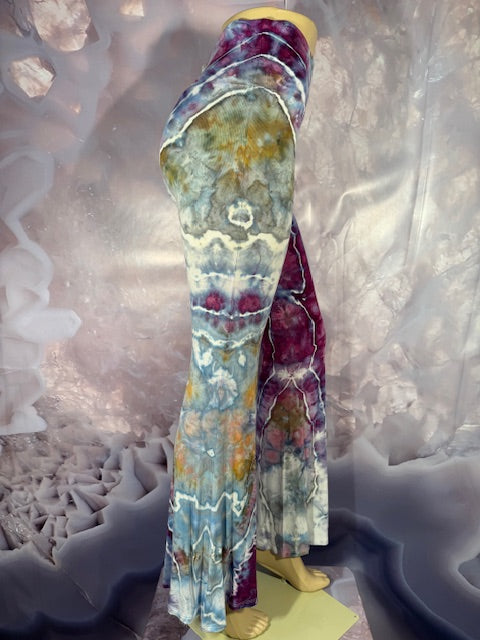These Pants have a slight Bell starting above the knee and a waist that can be high waisted or folded over.  The silhouette is long and sleek.