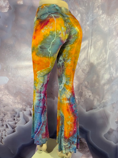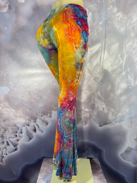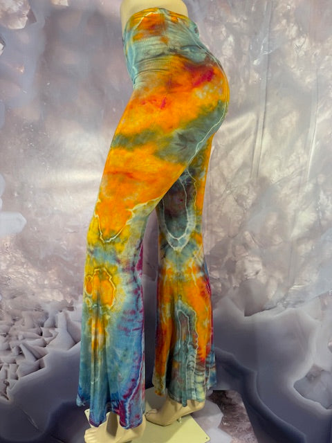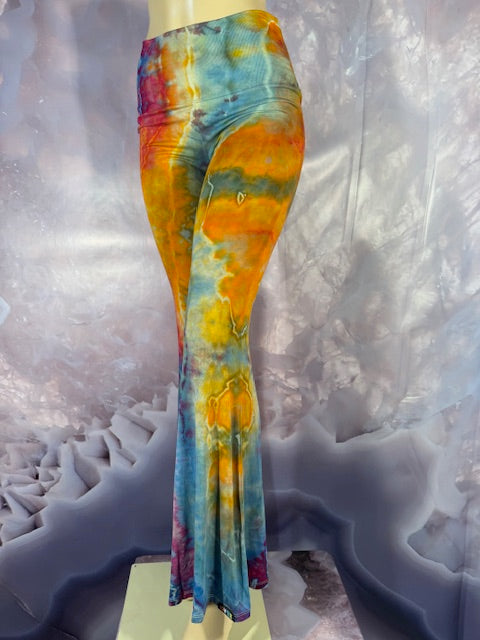 These Pants have a slight Bell starting above the knee and a waist that can be high waisted or folded over. The silhouette is long and sleek.