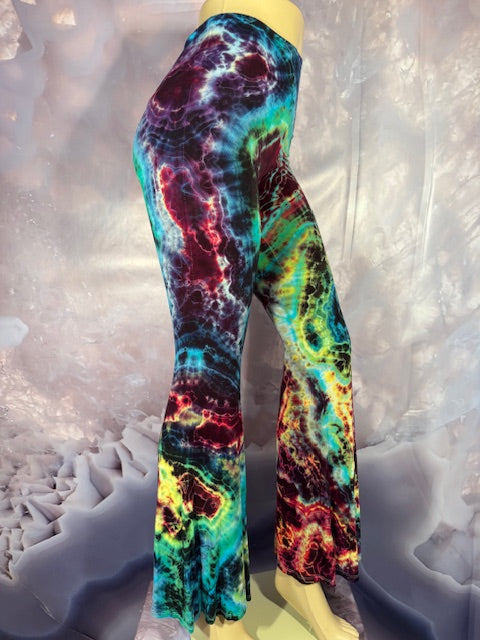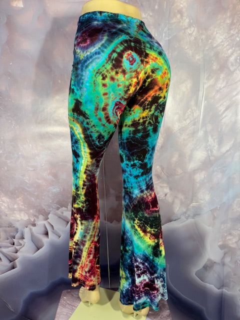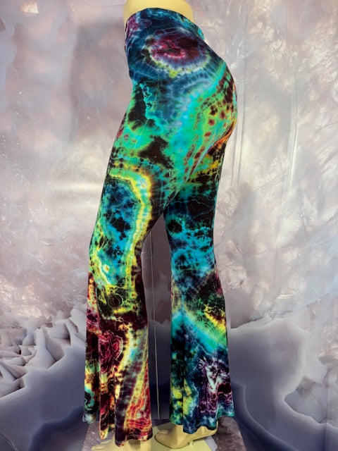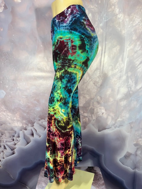 These Pants have a slight Bell starting above the knee and a waist that can be high waisted or folded over. The silhouette is long and sleek.