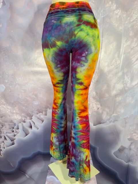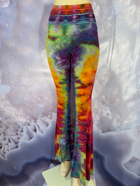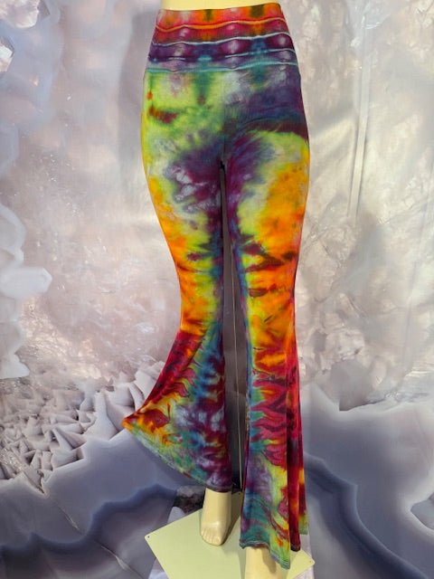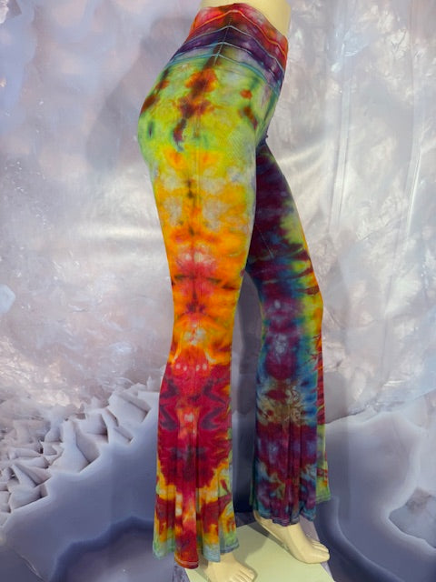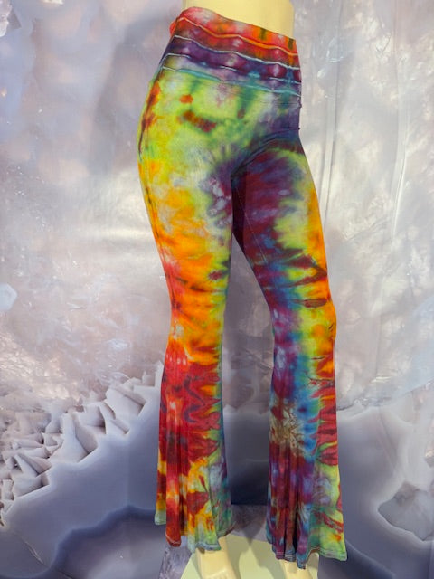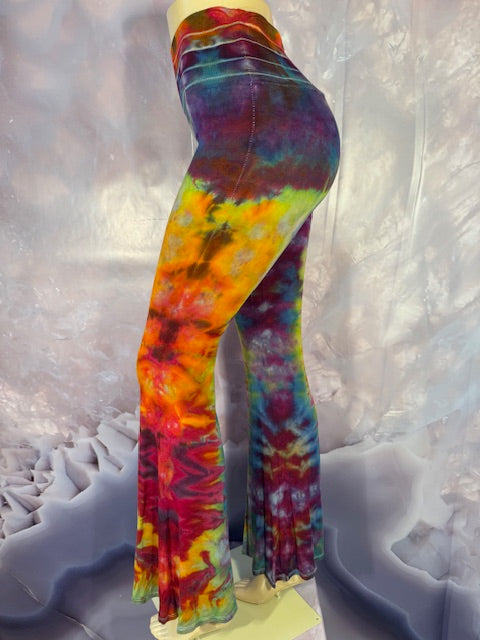 These Pants have a slight Bell starting above the knee and a waist that can be high waisted or folded over.  The silhouette is long and sleek.