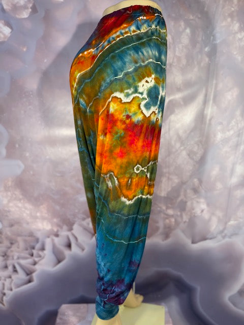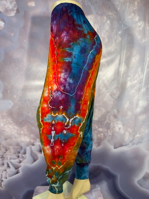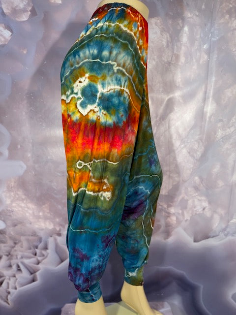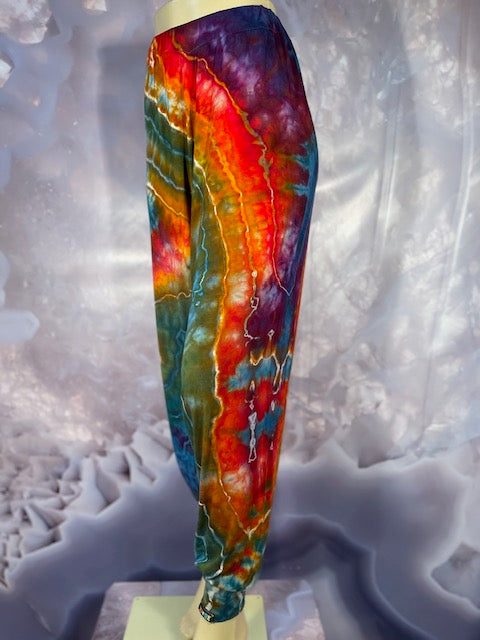 Cut & Sewn in California out of a Super Soft Rayon Cotton these magical pants are Ice Dyed by Mary Beth Osborn of MarybgoRound Dyes of Colorado.