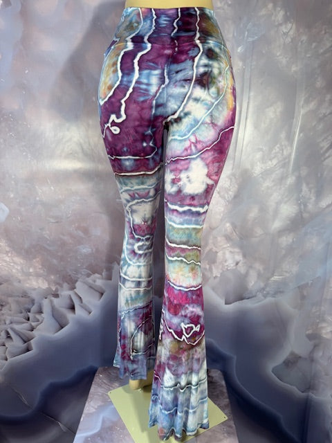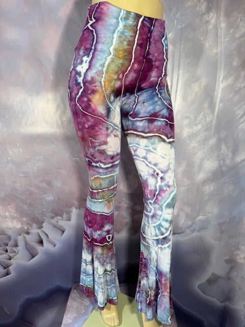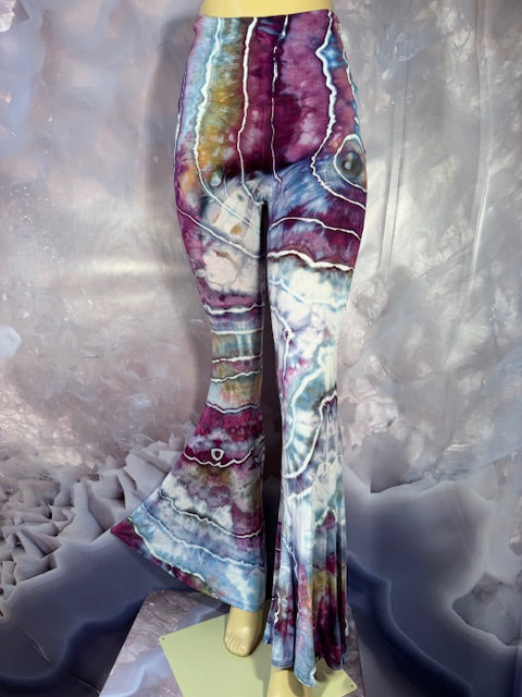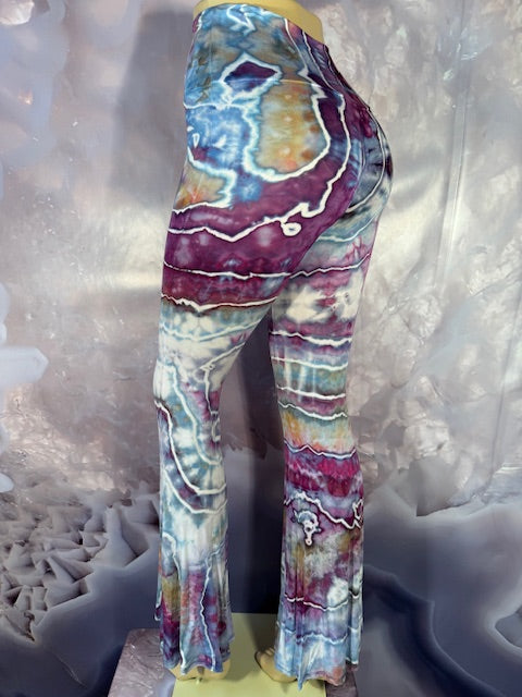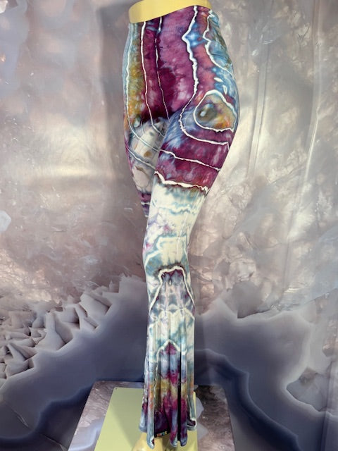 These Pants have a slight Bell starting above the knee and a waist that can be high waisted or folded over.  The silhouette is long and sleek.