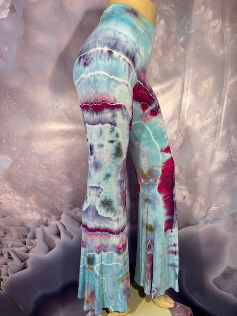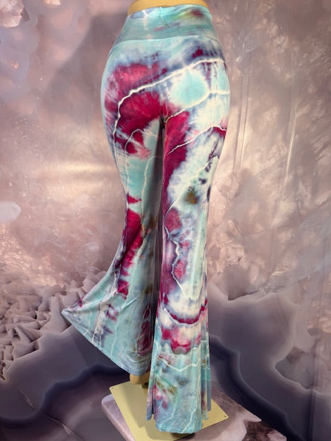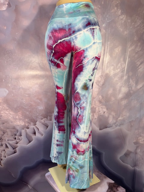These Pants have a slight Bell starting above the knee and a waist that can be high waisted or folded over. The silhouette is long and sleek.
