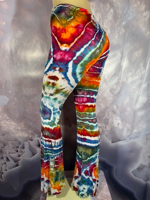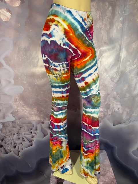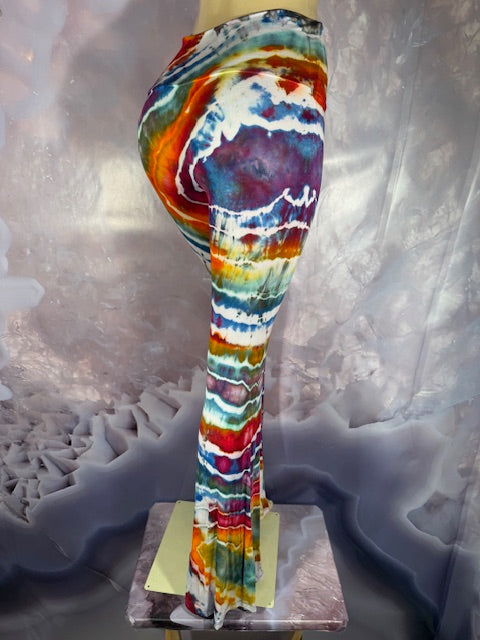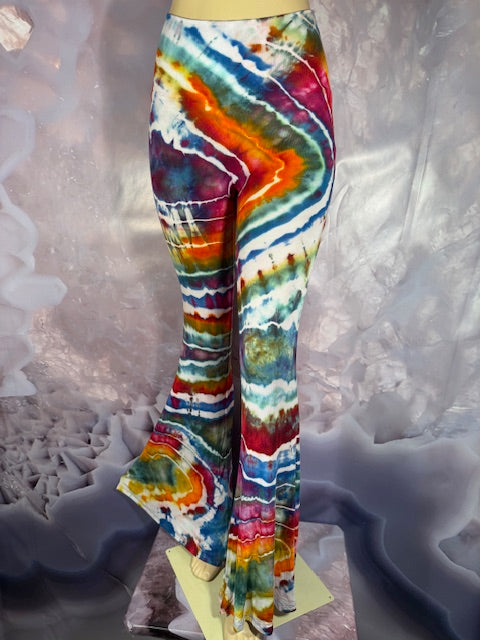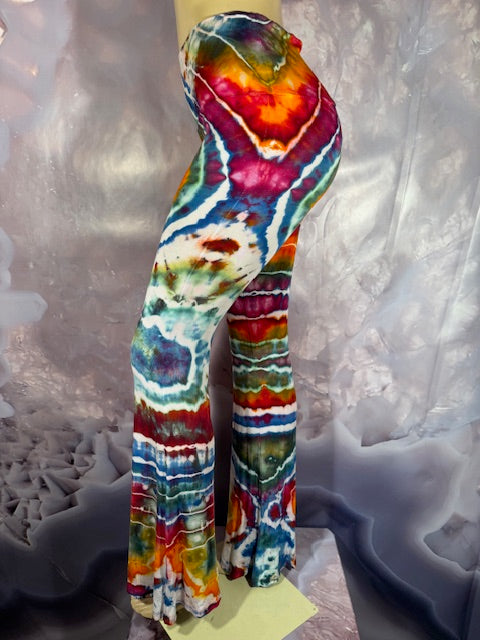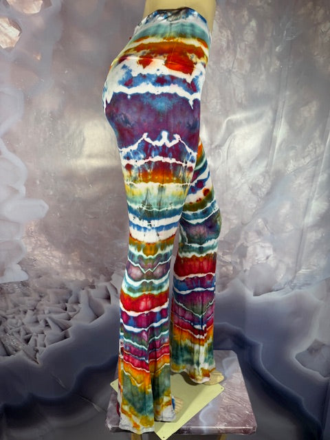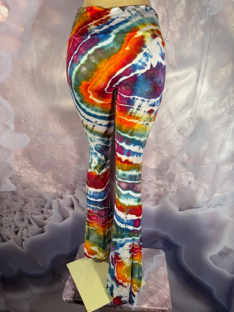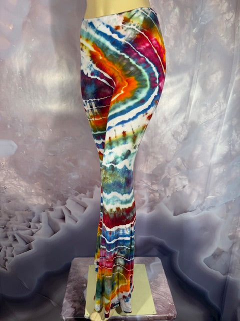 These Pants have a slight Bell starting above the knee and a waist that can be high waisted or folded over.  The silhouette is long and sleek.