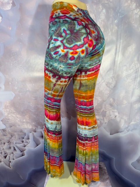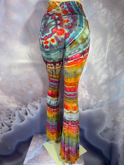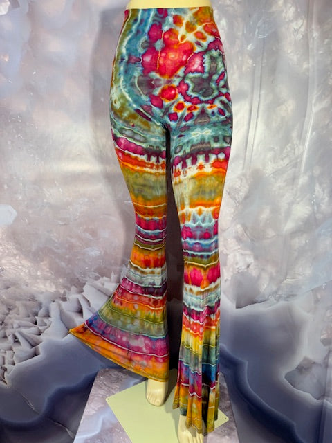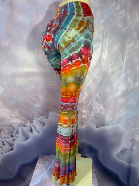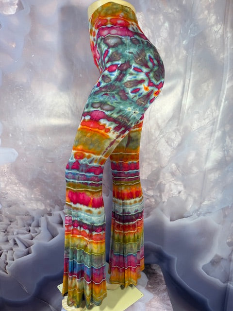 These Pants have a slight Bell starting above the knee and a waist that can be high waisted or folded over.  The silhouette is long and sleek.