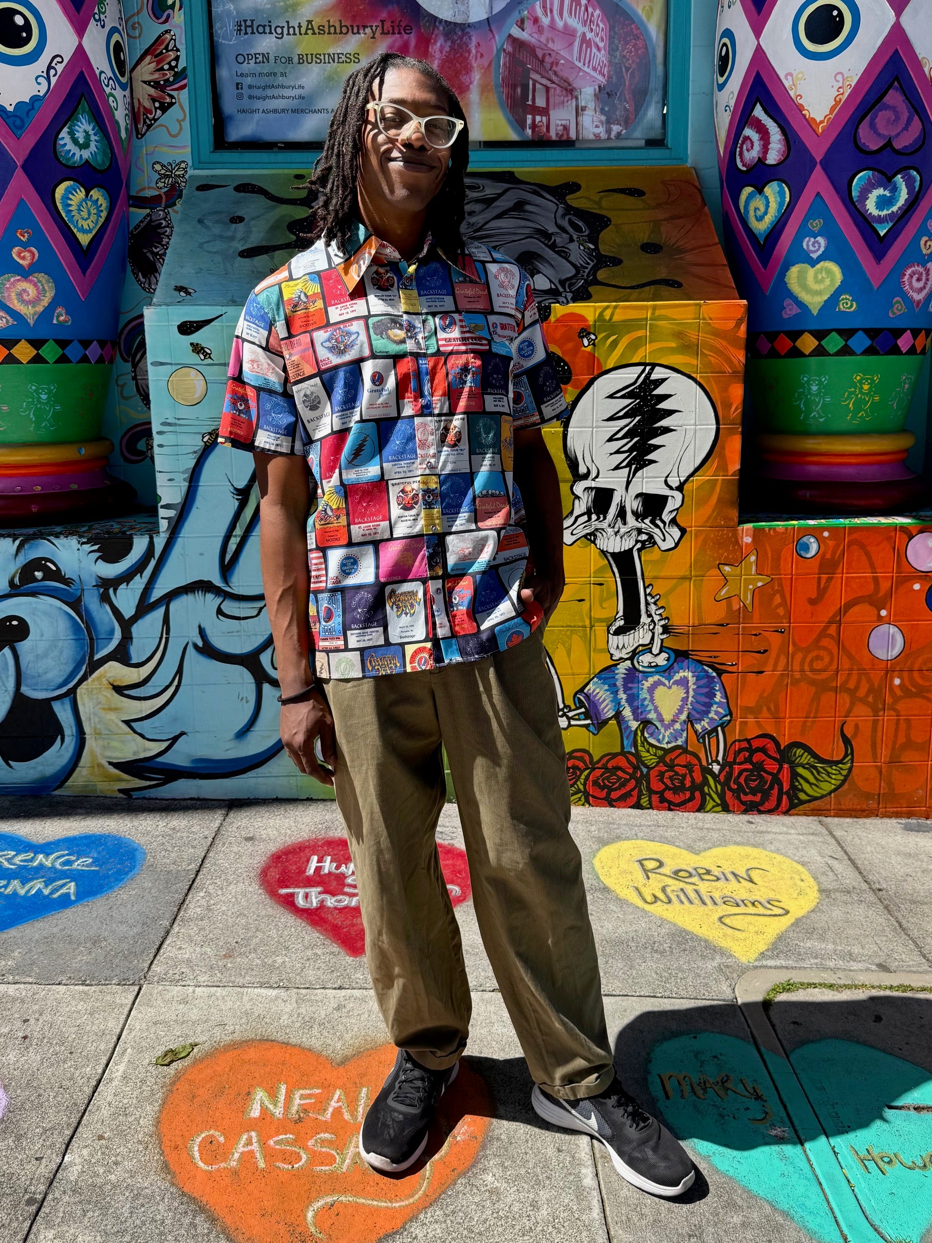 The loose, unisex fit makes this shirt perfect for 'Heads of all kinds.  The front placket has metal pearlized snaps that feature the iconic Grateful Dead Stealie, for an unexpected touch. The back neck yoke lining and chest pocket lining feature an iconic all-over Stealie print adding an extra hint of nostalgia.  The flat felled seams add an elevated experience, and unparalleled quality.  Lightweight, soft and breathable, the cotton blend fabrication has a light stretch adding extra comfort for a perfect fit.