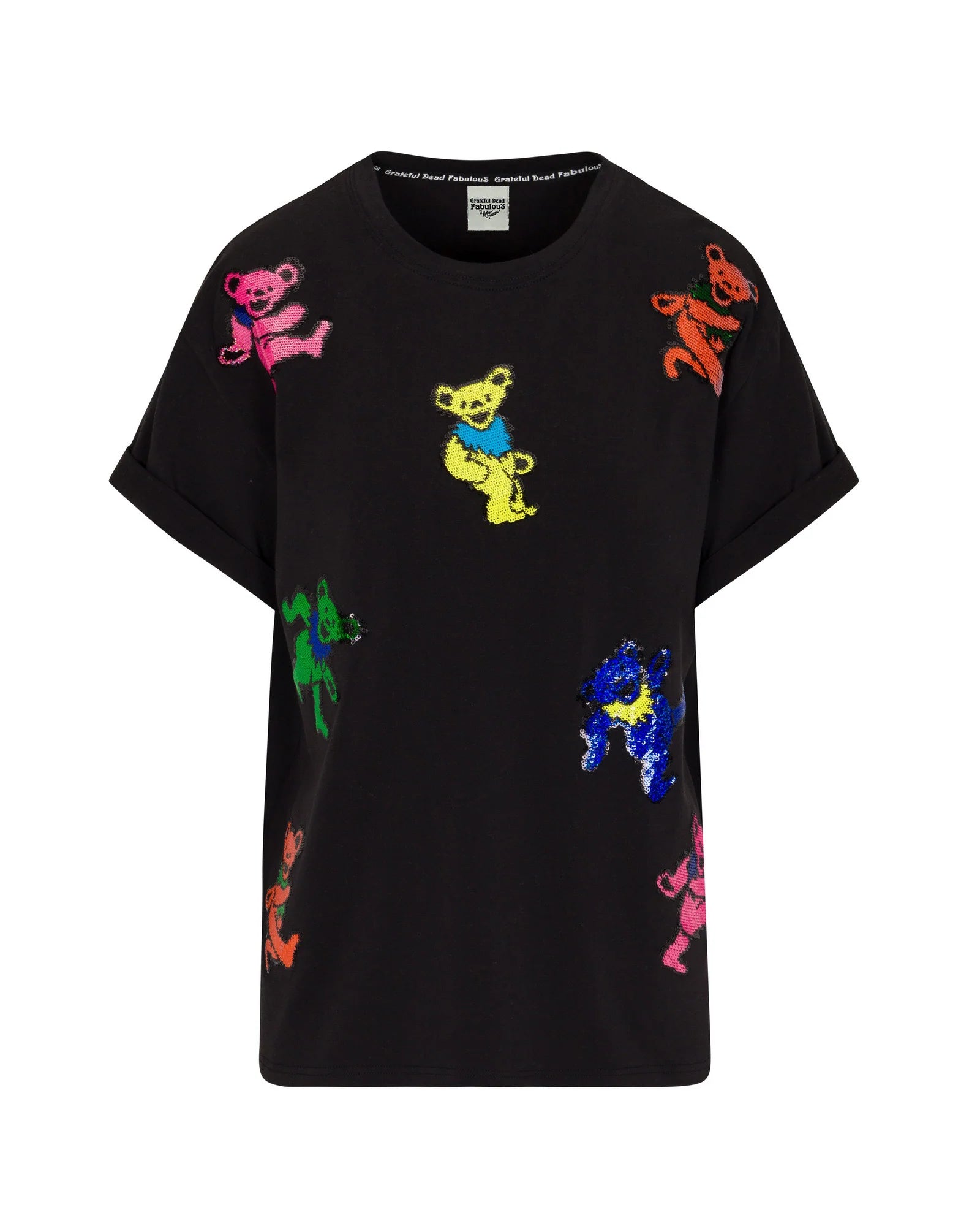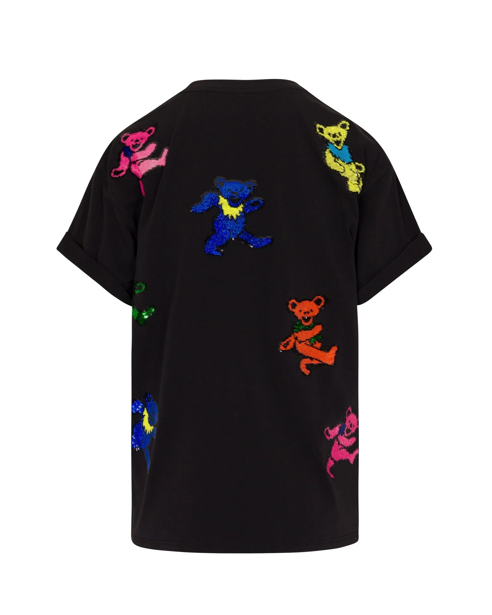 Featuring an all-over embroidered sequin Dancing Bear design, this top is like no other. The dancing bears are embroidered with colorful, sparkly sequins that catch the light and sparkle with every movement. The relaxed, loose fit makes this top perfect for 'Heads of all kinds! Crafted with a luxurious triple washed cotton blend, anti-pilling fabrication, this top is extremely soft and feels like butter-soft cashmere. Fully French-seamed with a signature Grateful Dead Fabulous back neck logo tape, this top is full of unexpected luxe features at every turn.