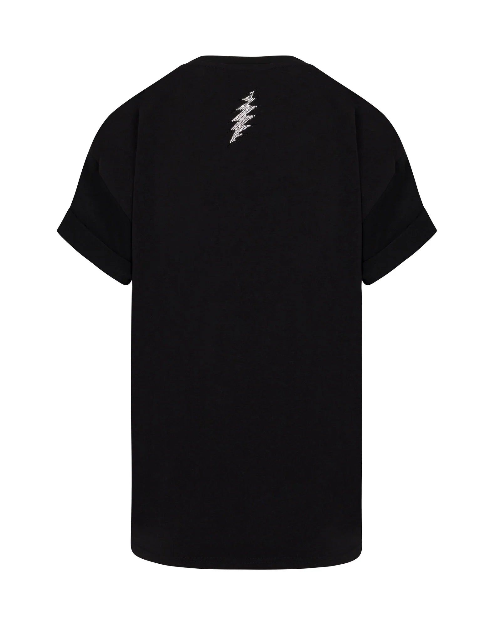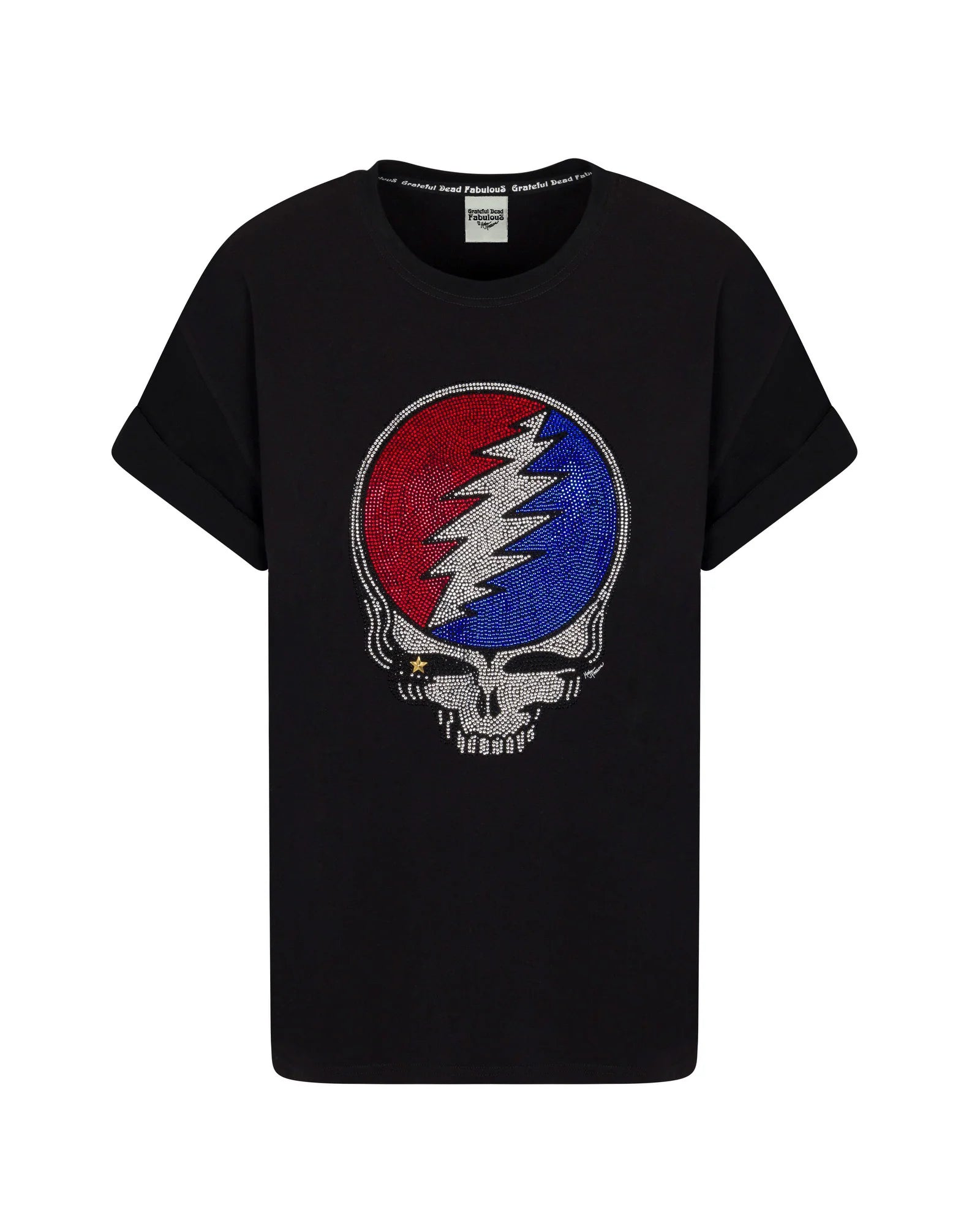 Featuring a big rhinestone Stealie design on the front, this top is like no other. Inspired by the Oracle Park drone show, each rhinestone is carefully placed to catch the light and sparkle with every movement. A gold star embellishes the Stealie's left eye and the center back features a 13 Pt. bolts highlighted in black and crystal rhinestones. The relaxed, loose fit makes this top perfect for 'Heads of all kinds! Crafted with a luxurious triple washed cotton blend, anti-pilling fabrication, this top is extremely soft and feels like butter-soft cashmere. Fully French-seamed with a signature Grateful Dead Fabulous back neck logo tape, this top is full of unexpected luxe features at every turn. The best part: It's totally washable.