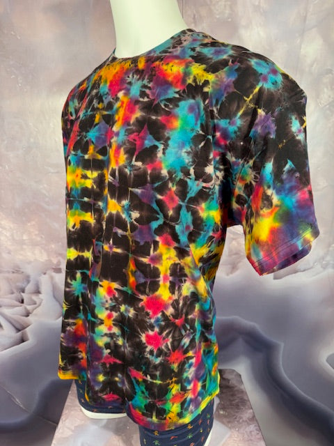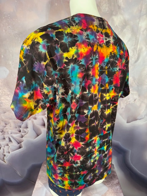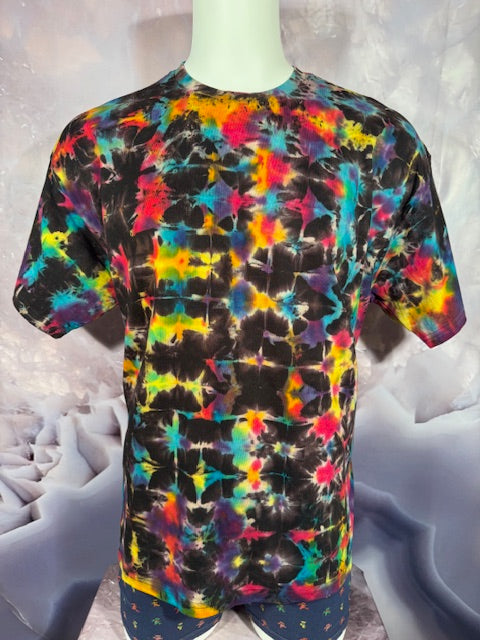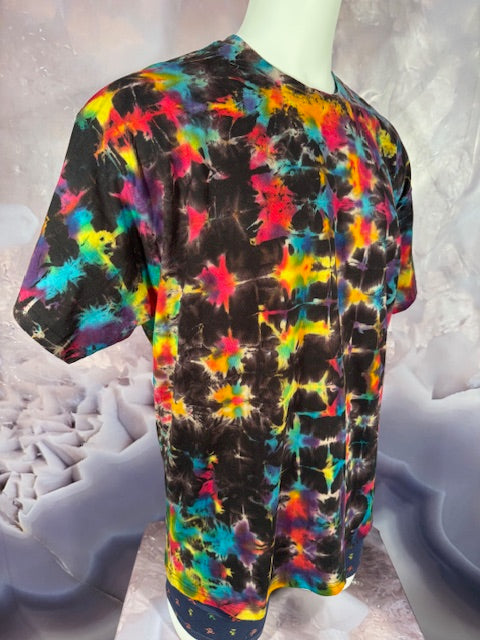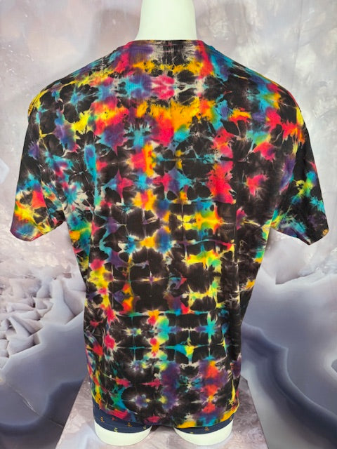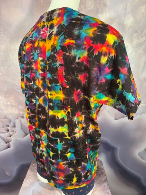 Custom made 100% cotton shirts (not a soft cotton) the shirts started out black then got their REVERSE magic done on them with some ELECTRIC Colors.