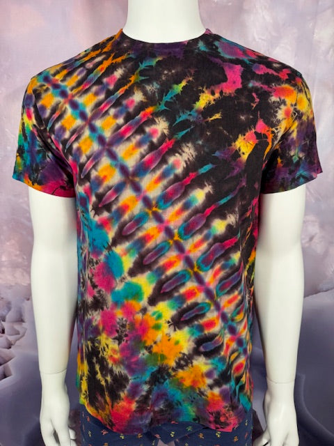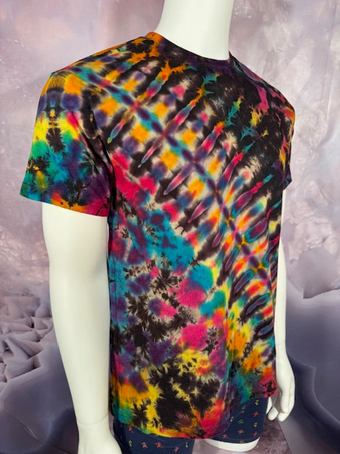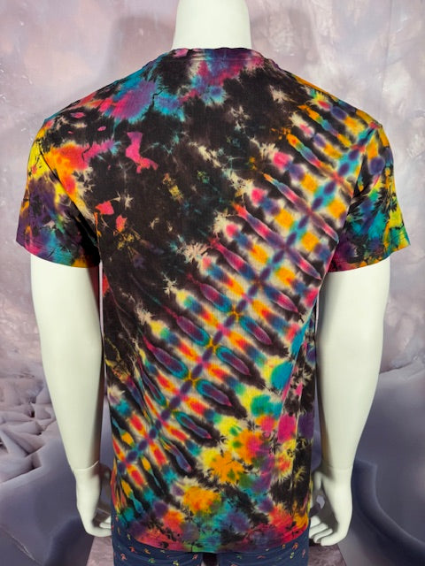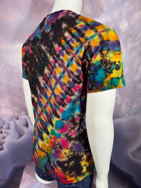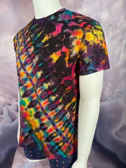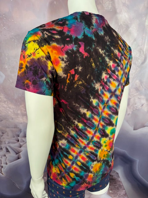 Custom made 100% cotton shirts (not a soft cotton) the shirts started out black then got their REVERSE magic done on them with some ELECTRIC Colors.
