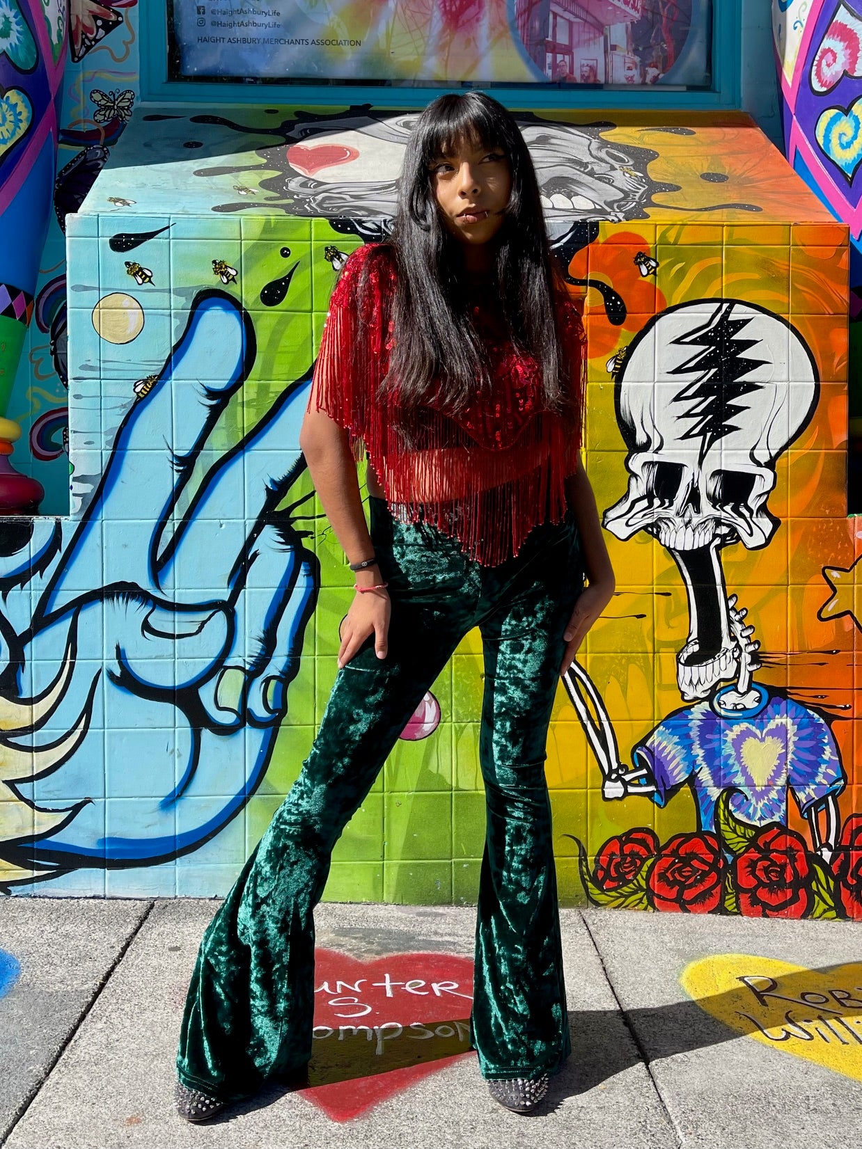 Gorgeous fitted bell bottom pants in lush black crushed velvet.