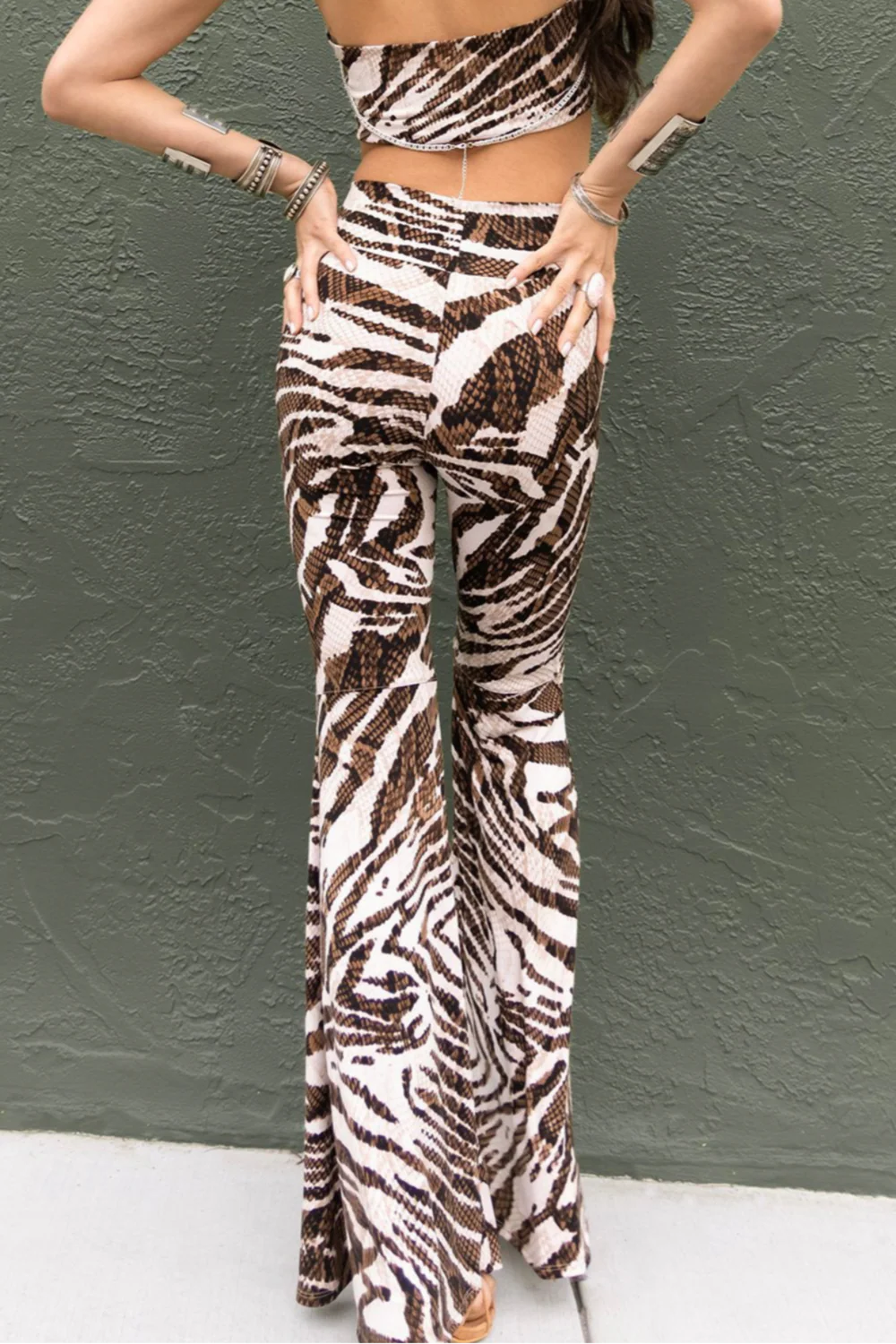 iconic Sophie Bells, in a warm brown and ivory animal print.