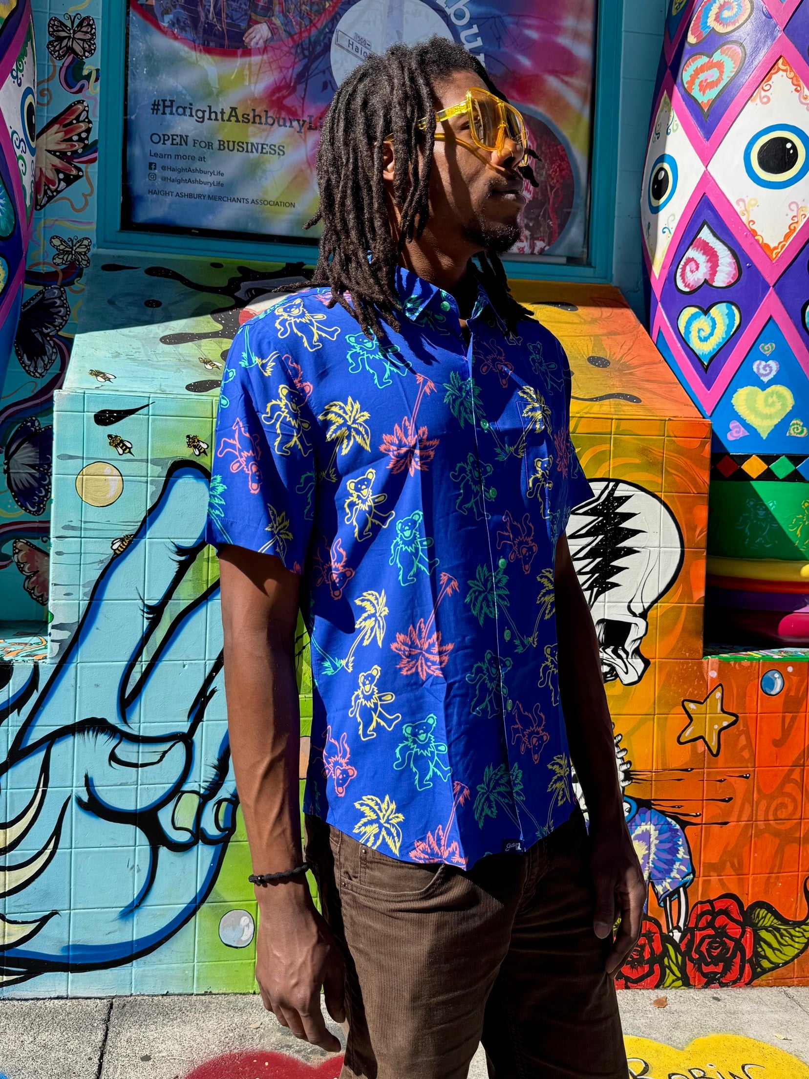 The Grateful Dead Neon Palm Tree & Dancing Bears Short Sleeve Button Down will be sure to attract compliments from fans and non-fans alike! Feel the music every time you put it on.