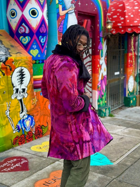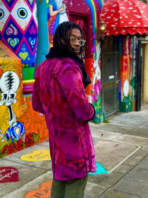Lined in silk, made in SF, reversible and hand dyed by our very own Sunshine Powers, 10 blocks away in the Haight Ashbury.