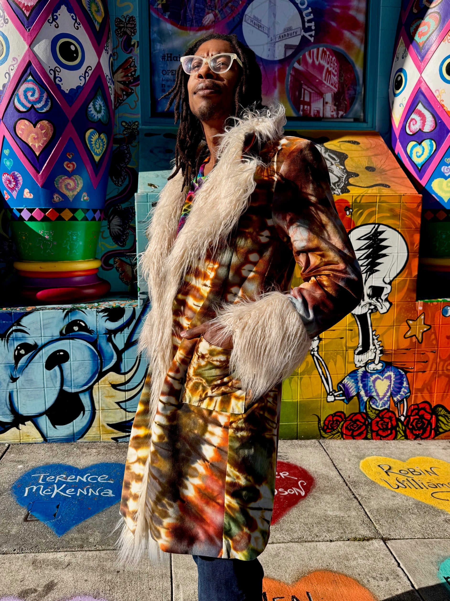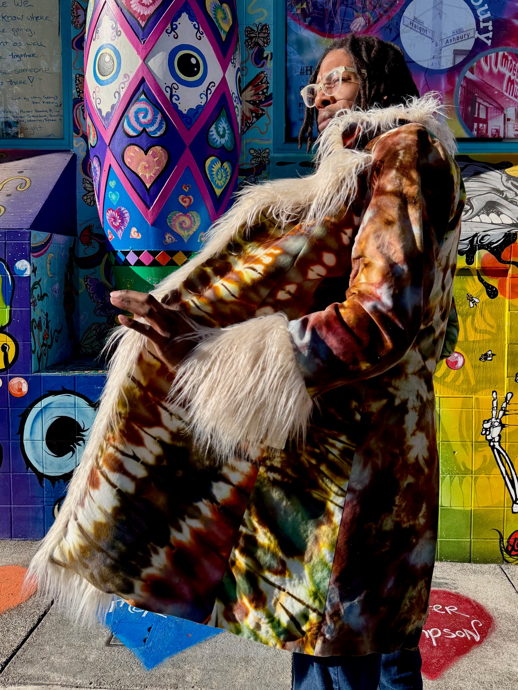 by How we met Philine. Sunshine was at SF Fashion week a few years back and she had been hankering for some new coats, she has like 4 pirate coats but wanted something for more everyday wear. As she wondered around the room before the fashion show she found these amazing coats that she wanted even though they were not tiedyed (if you know Sunshine, you know that she wears everything tiedye so this emotion was new to her.) . Sunshine approached Philine and said, "I have this idea about these coats but tiedyed!" Philine smiled at Sunshine like she was nuts. Sunshine then said, "I am totally crazy, but these coats are going to be AWESOME."