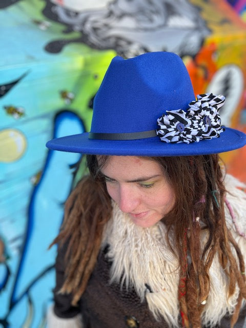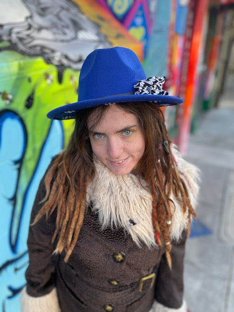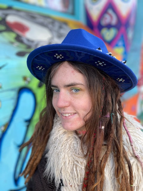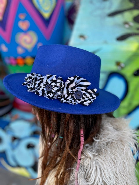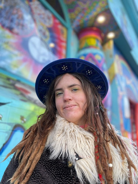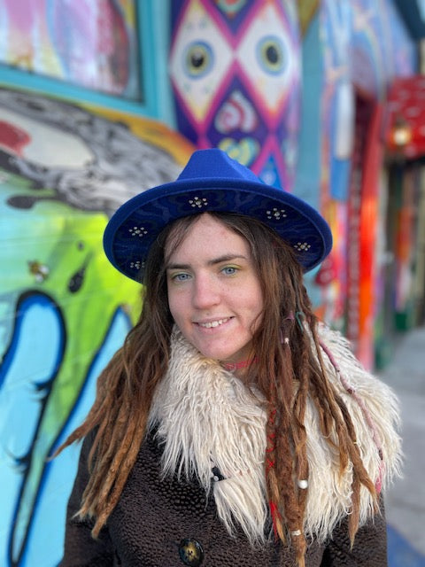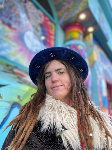 Made right here in the Haight Ashbury area of San Francisco by our very own Ravan Alexandra!  These are hand painted one of a kind hats.  The flowers and bands can be taken off so you don't have to wear them all the time.
