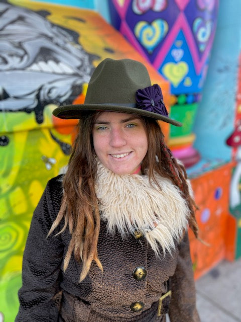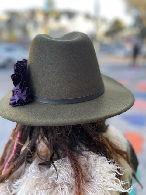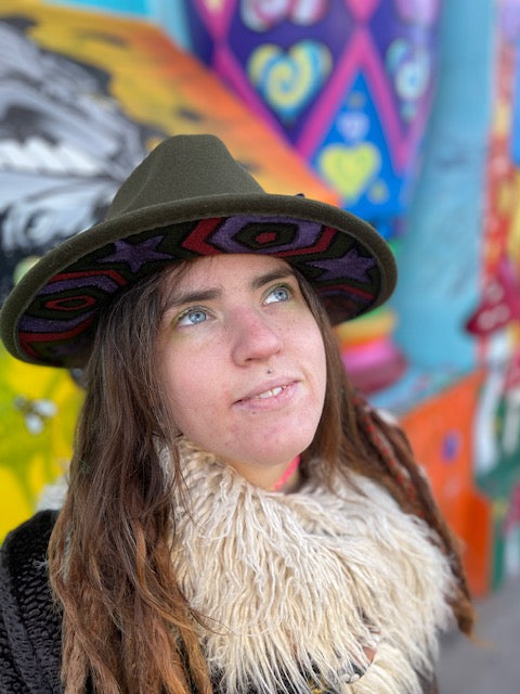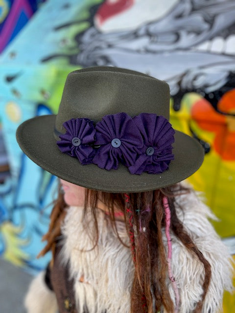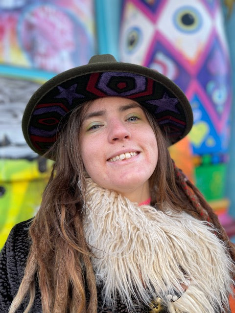 Made right here in the Haight Ashbury area of San Francisco by our very own Ravan Alexandra!  These are hand painted one of a kind hats.  The flowers and bands can be taken off so you don't have to wear them all the time.