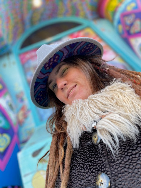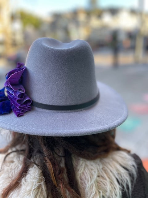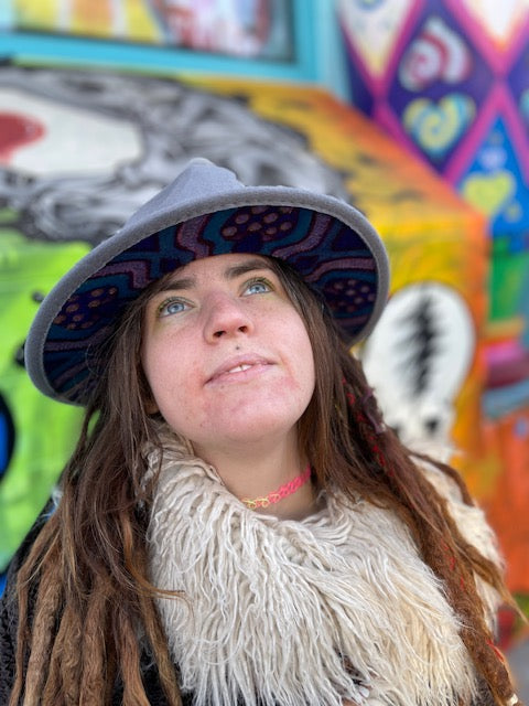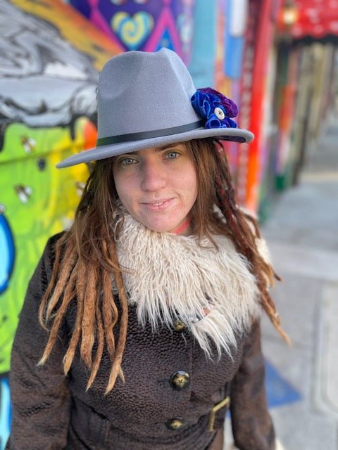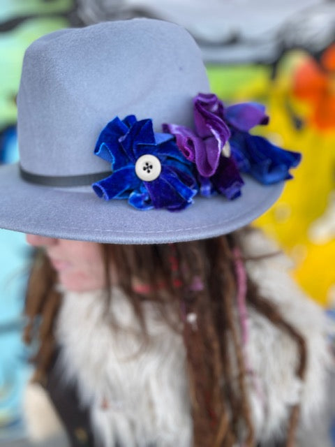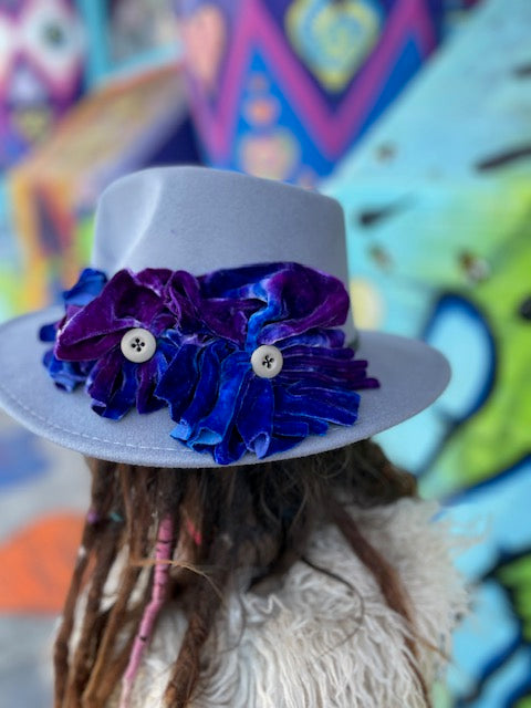 Made right here in the Haight Ashbury area of San Francisco by our very own Ravan Alexandra!  These are hand painted one of a kind hats.  The flowers and bands can be taken off so you don't have to wear them all the time.