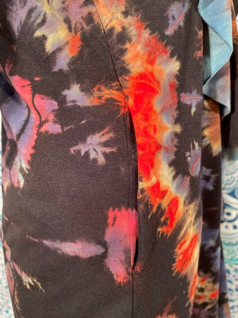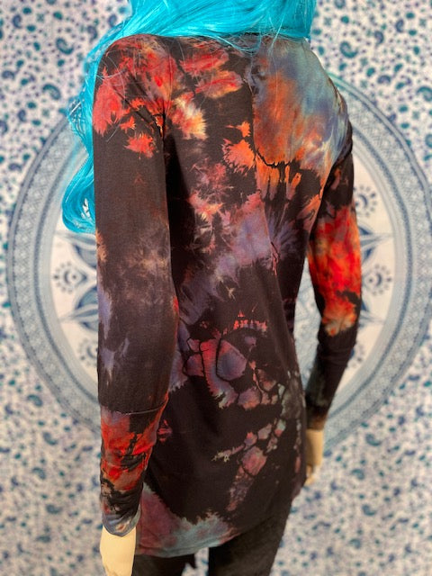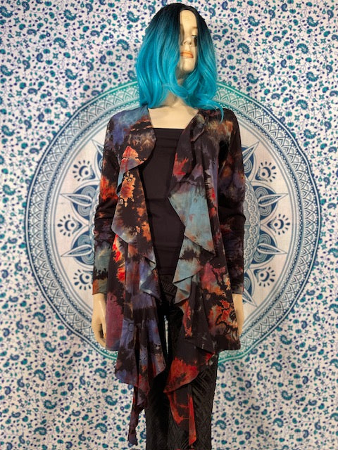 The magical Cardigan is cut and sewn in San Francisco by Warrior Within Designs out of Organic Bamboo....OMG So soft!!! Then we mail them to our traveling tiedye artist Michael Martelli so he can do his REVERSE magic on the awesome cardigans!
