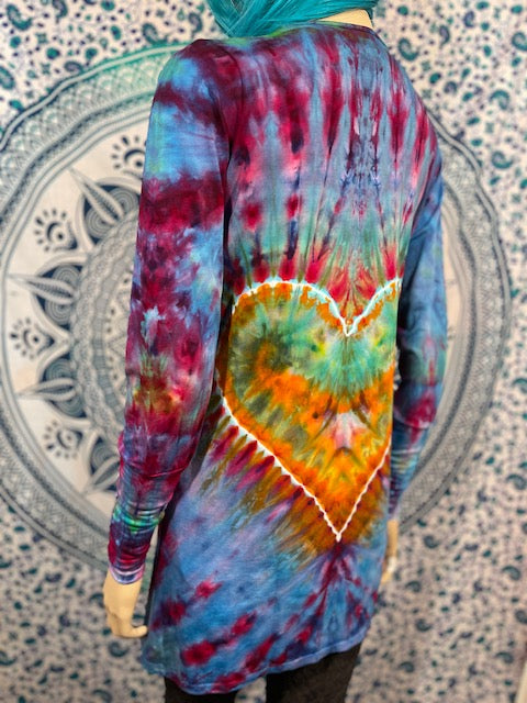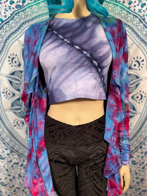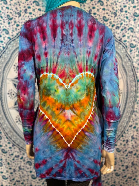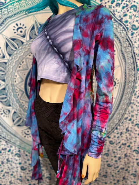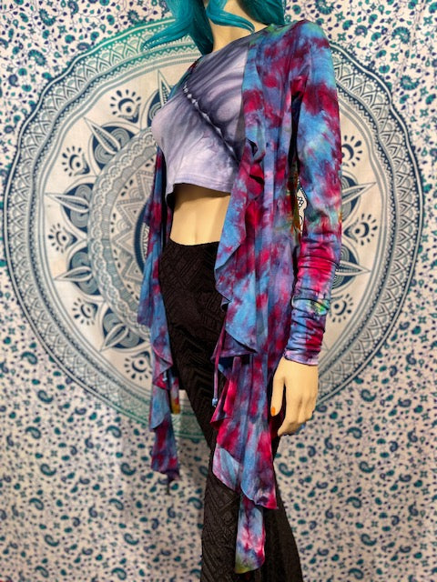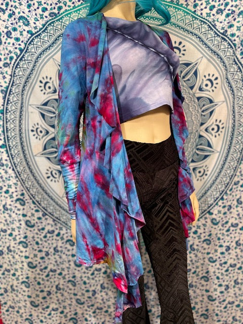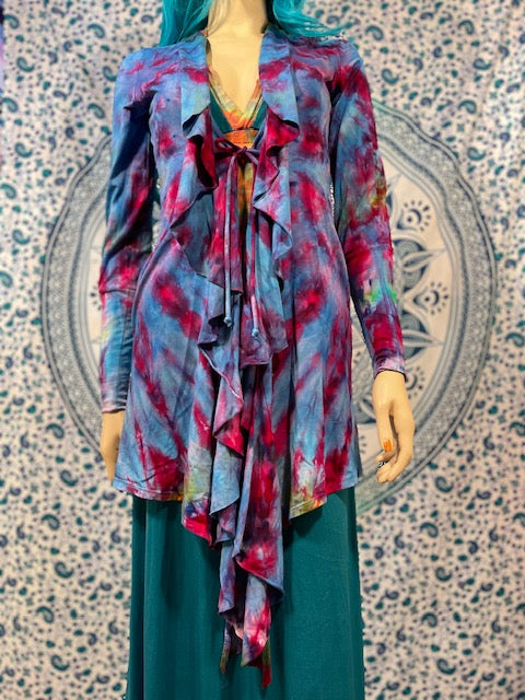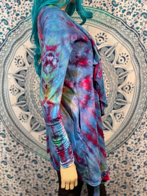 Fitted arms that make you feel pulled together, with a cascading collar, a tie at the chest so you can close her on up and POCKETS, this is the ultimate in tie dye!