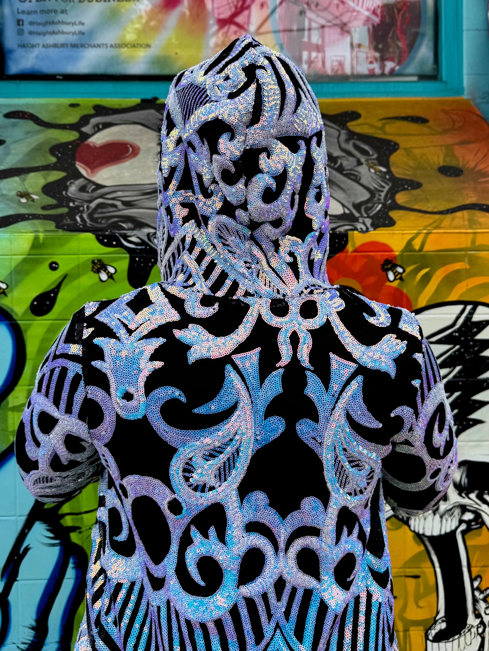 Make any occasion a special one in the Deluxe Sequin Tamo Coat! From a night on the town to your festival dreams, you'll be the star of the show in this statement coat. The sequin pattern shifts in the light to reveal a spectrum of colors as you move from one fabulous moment to the next. Our long coat is stylish, soft, warm, surprisingly lightweight, easy-to-wear, and even easier to care for. This unisex style looks great on all shapes and is locally made from the highest quality materials in San Francisco.