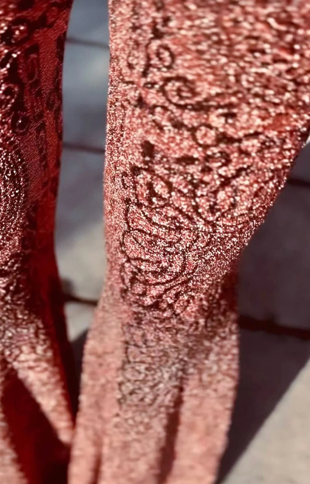 Temple Ro's signature Sophie Bell Bottoms in a metallic copper double knit. The perfect festival pant for dancing all day in the sun or all night under the stars.